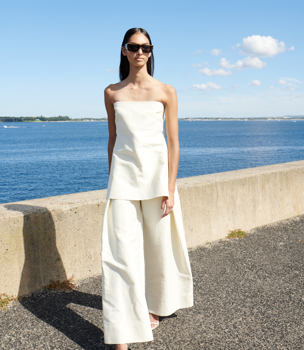 TAILORED STRAPLESS TUNIC, SHOP SIMILAR, TAILORED FOLD TROUSERS, SHOP SIMILAR, ST AGNI. OPYUM SANDALS IN SMOOTH LEATHER WITH GOLD TONE HEEL, SAINT LAURENT, SHOP NOW