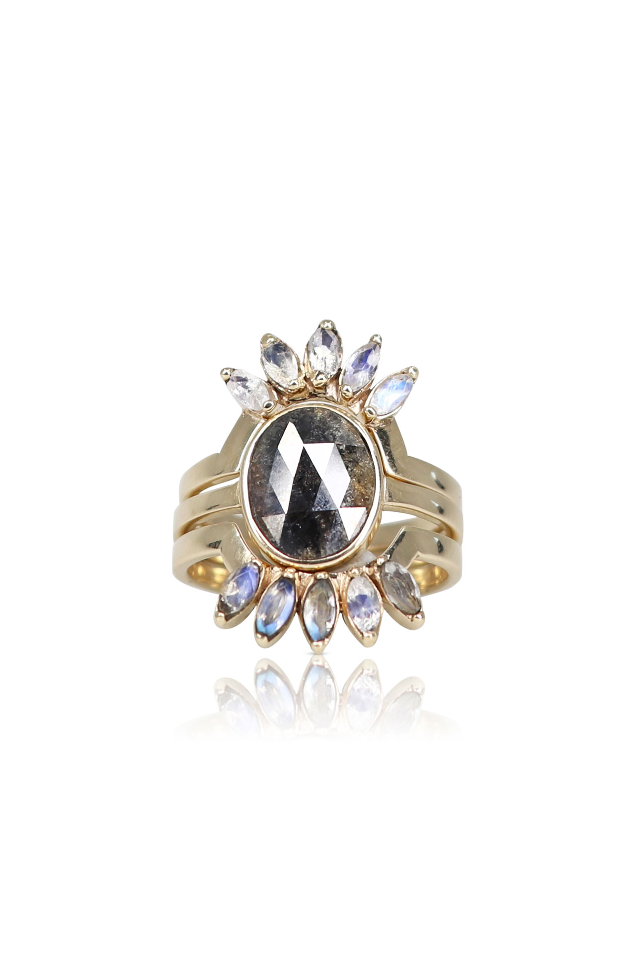 Images: (1) Three-stacker, moonstone and grey diamond (2) Rutilated quartz, black diamond double stack (3) Rutilated quartz, white diamond and moonstone double stack (4) Double stack, black, white and grey diamonds (5) Champagne diamond with white diamond and moonstone (6) Grey and white diamonds (7) Grey and black diamonds (8) Rutilated quartz and starburst moonstone stacker (9) Rutilated quartz