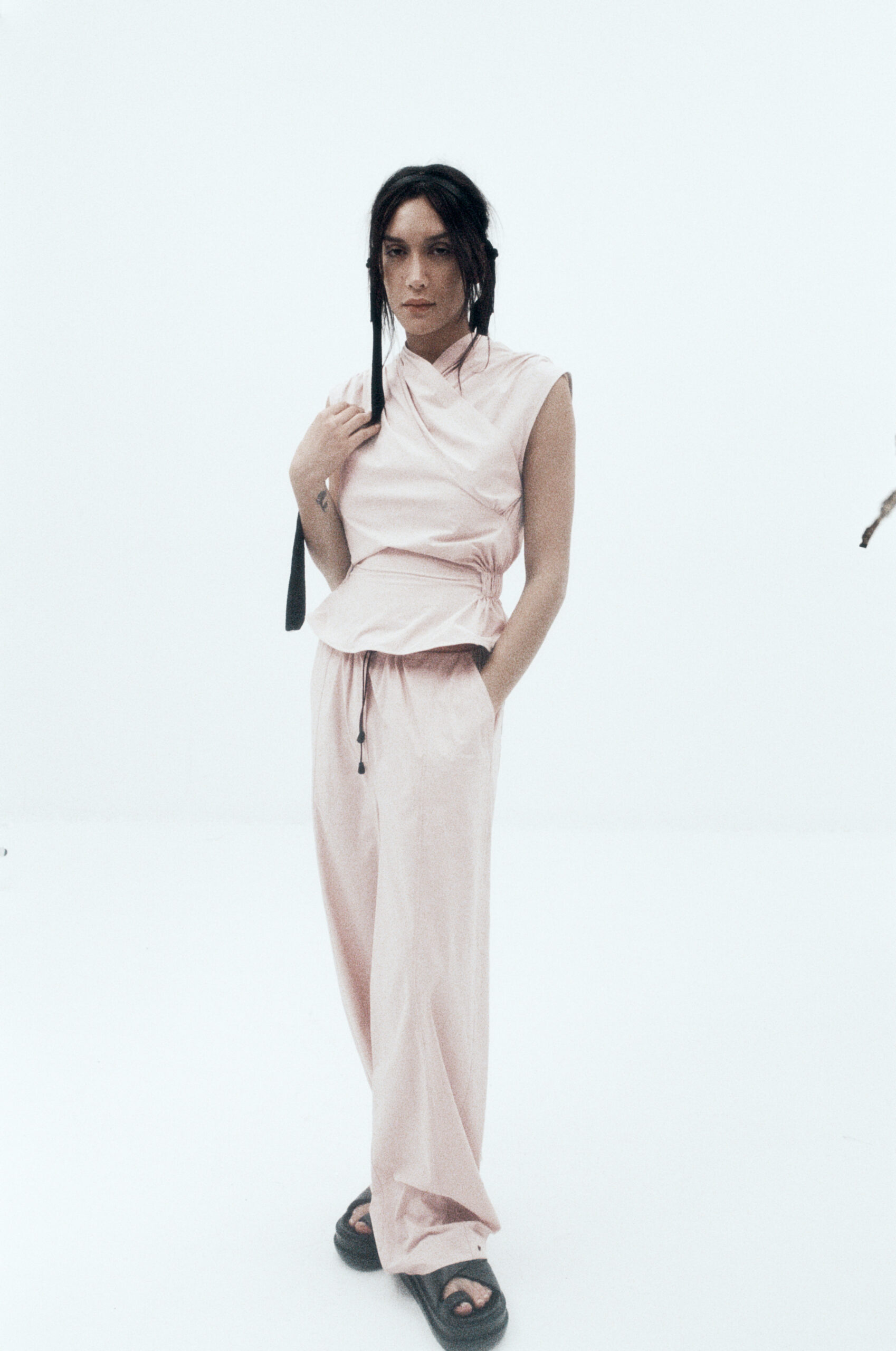 Accessories ground the fantasy with thoughtful symbolism: a hand-beaded headpiece and pearl belt act as modern relics, cinching, framing, and punctuating the fluidity with the deliberate tension of Harris Tapper’s softly commanding vision.