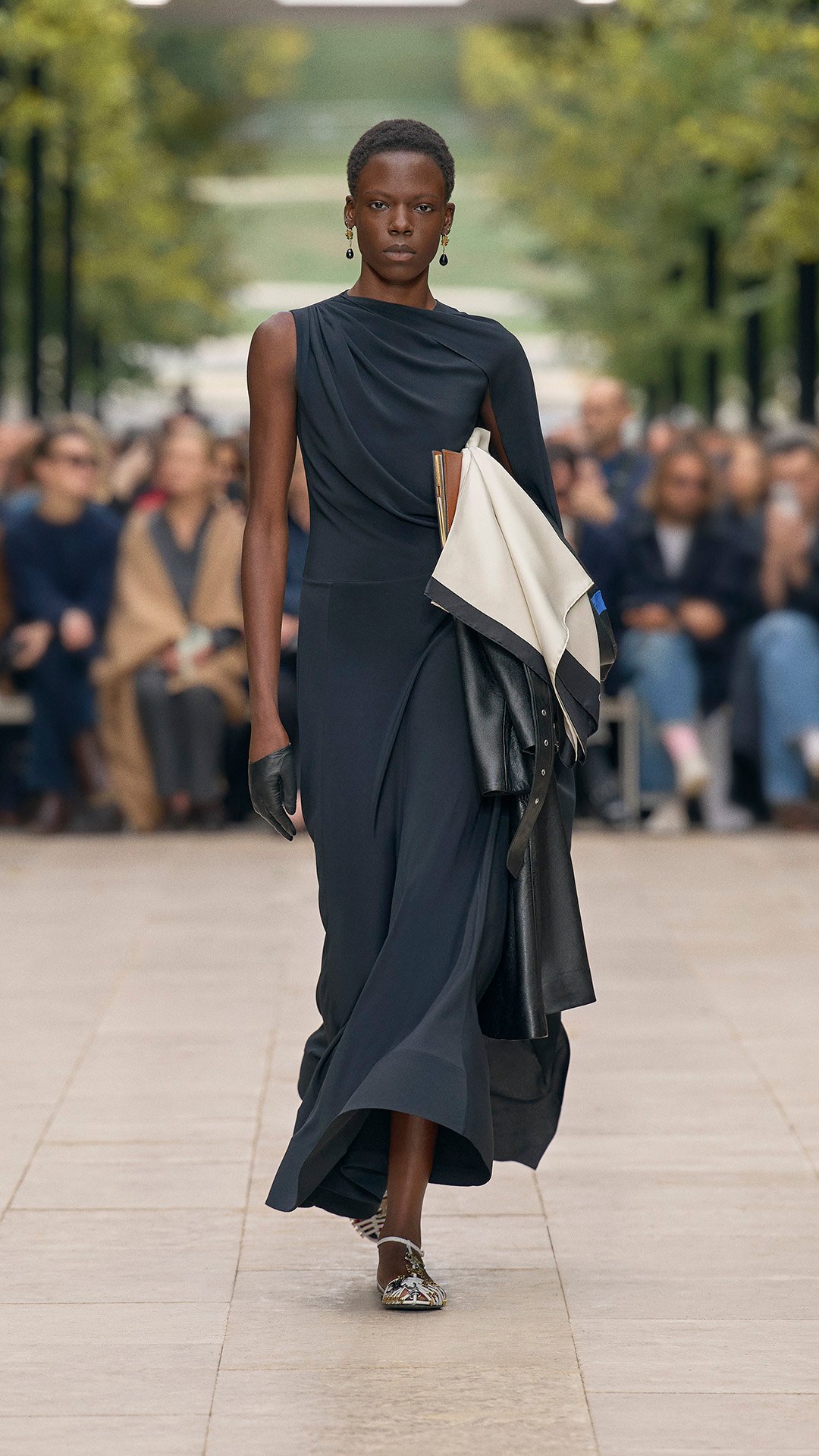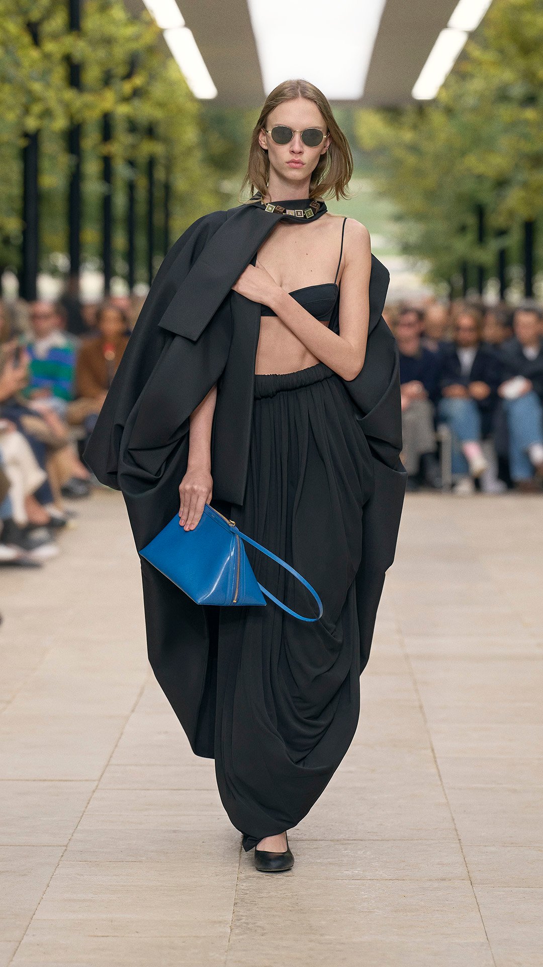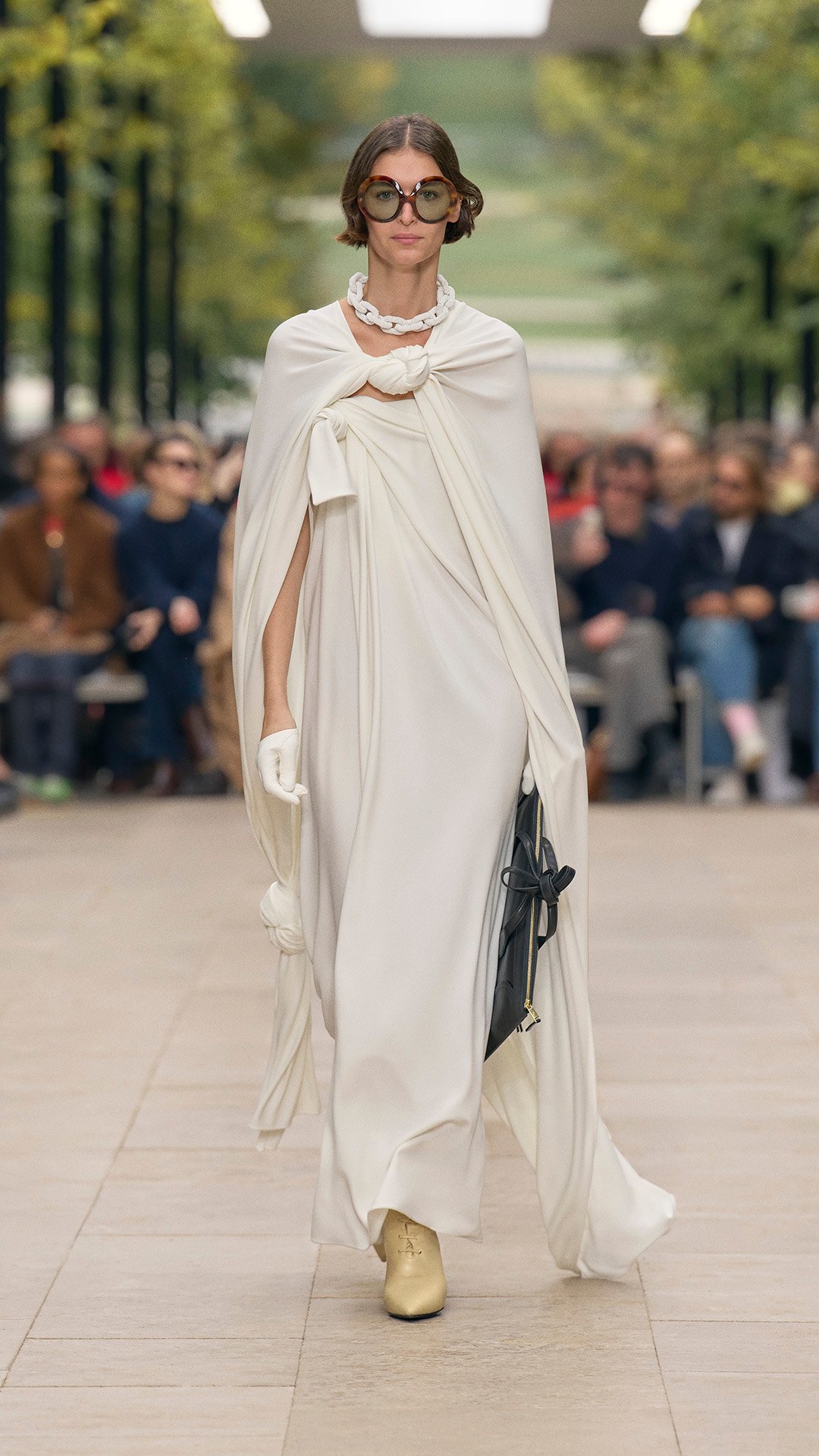 For Spring/Summer 2026, Rider honed his preppy-bourgeois lexicon with newfound confidence and lightness. The satin scarves that became the instant icons of his debut returned, knotted over shoulders and threaded through belts and other accessories. Navy blazers and equestrian chinos mingled with printed minidresses, layered jewellery and belts that could speak to both polish and play. It was a wardrobe for the woman who can be the life of the party just as well as she can host one.