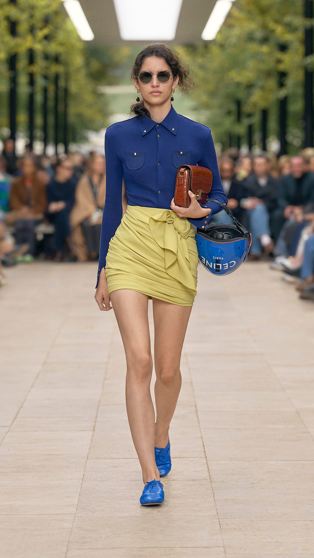References to the French Maison’s storied past were also handled with care. There were whispers of Phoebe Philo’s era in the artful prints, a Slimane-style edge in the skinny and sharper silhouettes, but this was distinctly Rider’s Celine, where collegiate refinement is softened by a Parisian insouciance. The palette had its own commanding energy—red, cobalt, yellow—woven through florals, miniskirts, and even the linings of coats, radiating the joy of a sun-soaked season.