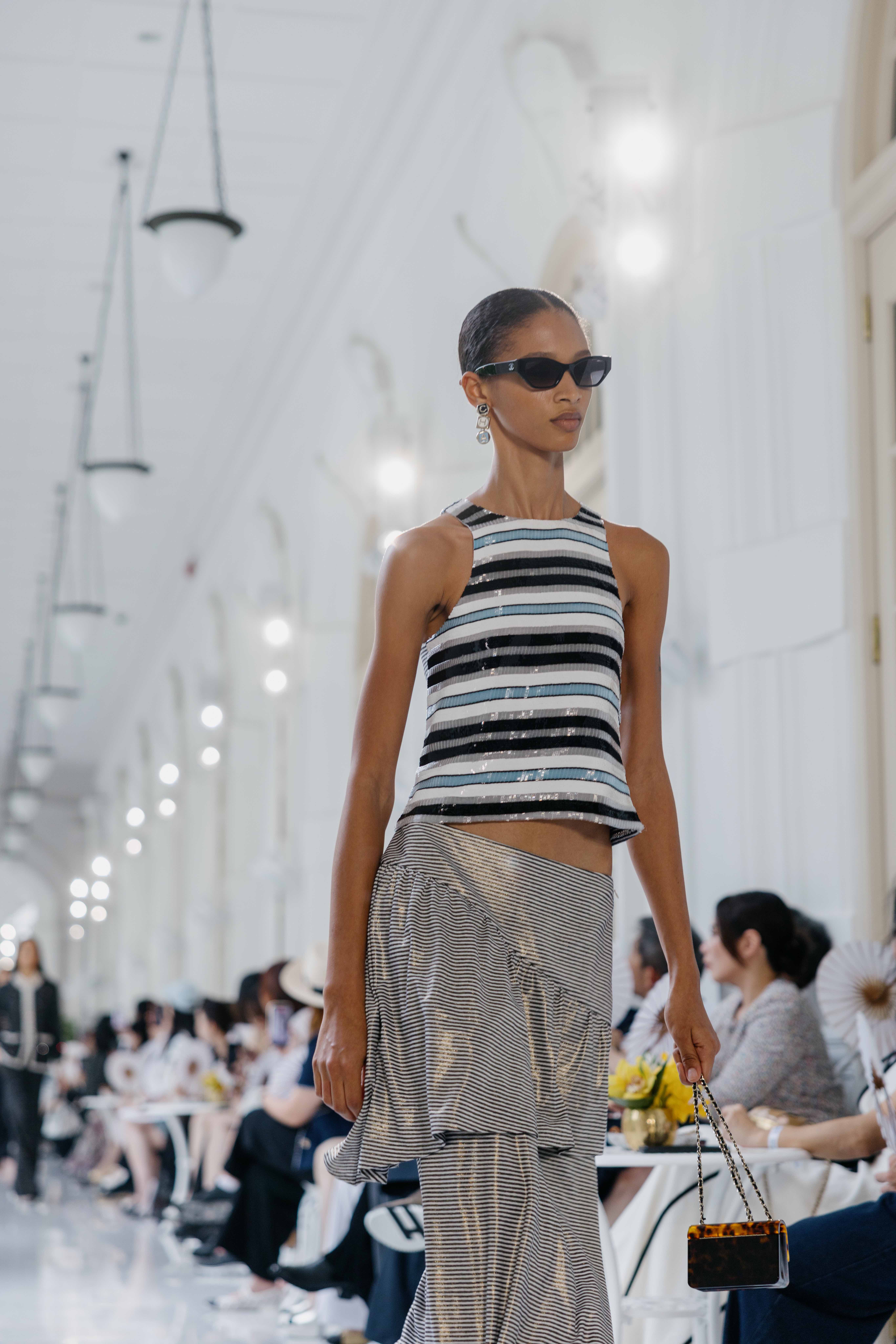The collection itself is an ode to luxurious ease. Models floated through the tropical evening in shimmering trouser suits, lamé stripes, and sequinned sets, offering looks that blurred the line between daydream and balmy after-dark moments. Taffeta ball gowns were paired with long gloves, while white trousers, crochet and sailor stripes nodded to classic cruise codes. Accessories, too, told their own stories, with silk scarves tied at the wrist or ankle, oversized sunglasses, and pearls catching the light. In hands and over the shoulders were woven totes and classic flap bags in reimagined hues. It was, in true Chanel fashion, a study in balance, always romantic yet refreshingly practical.