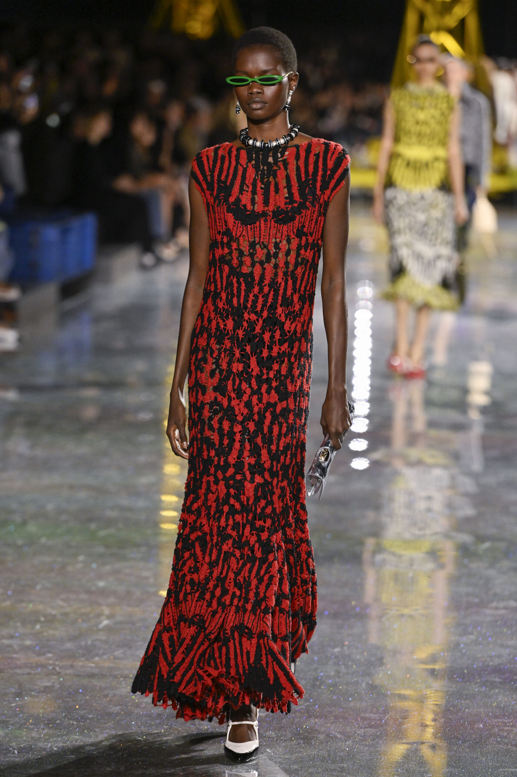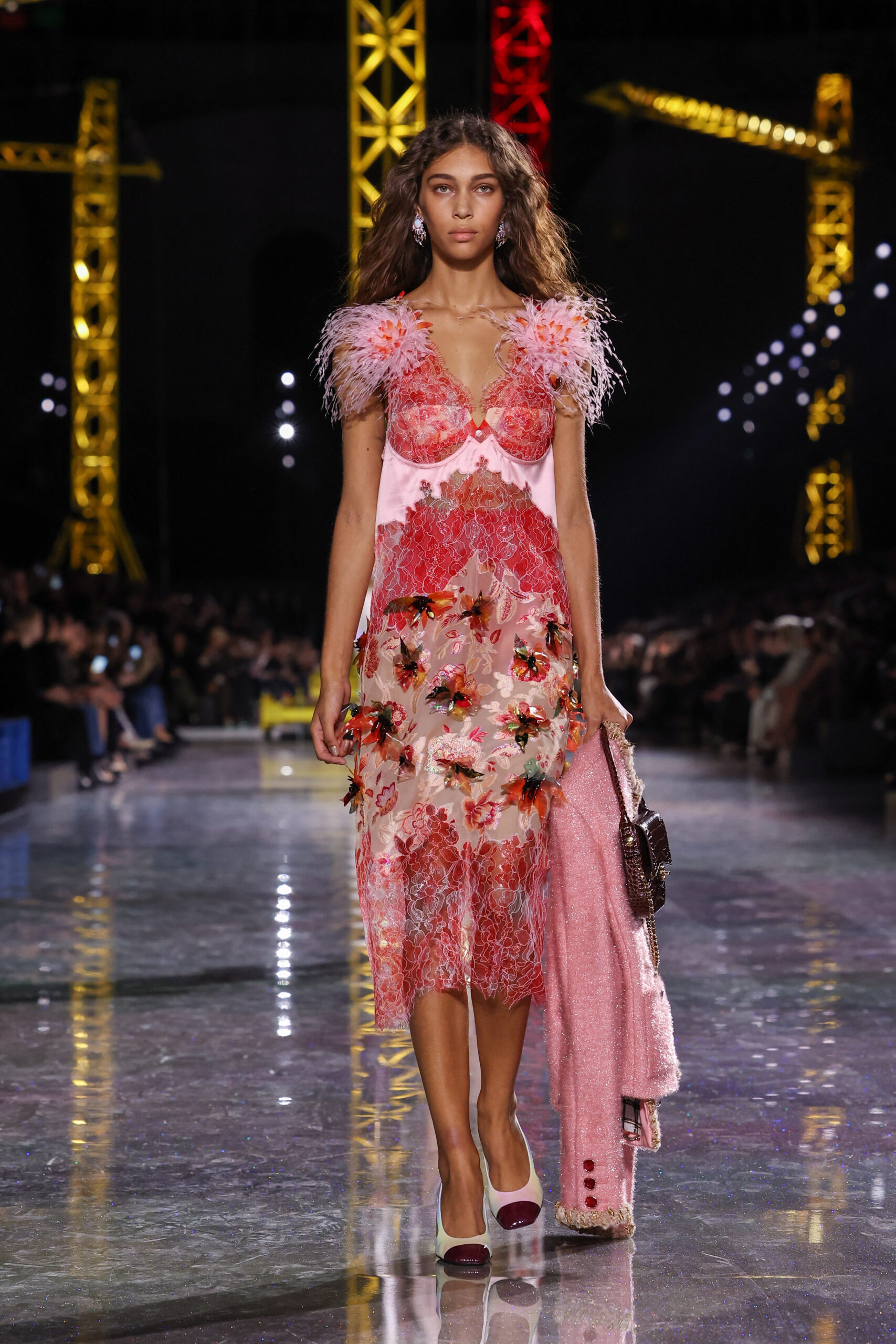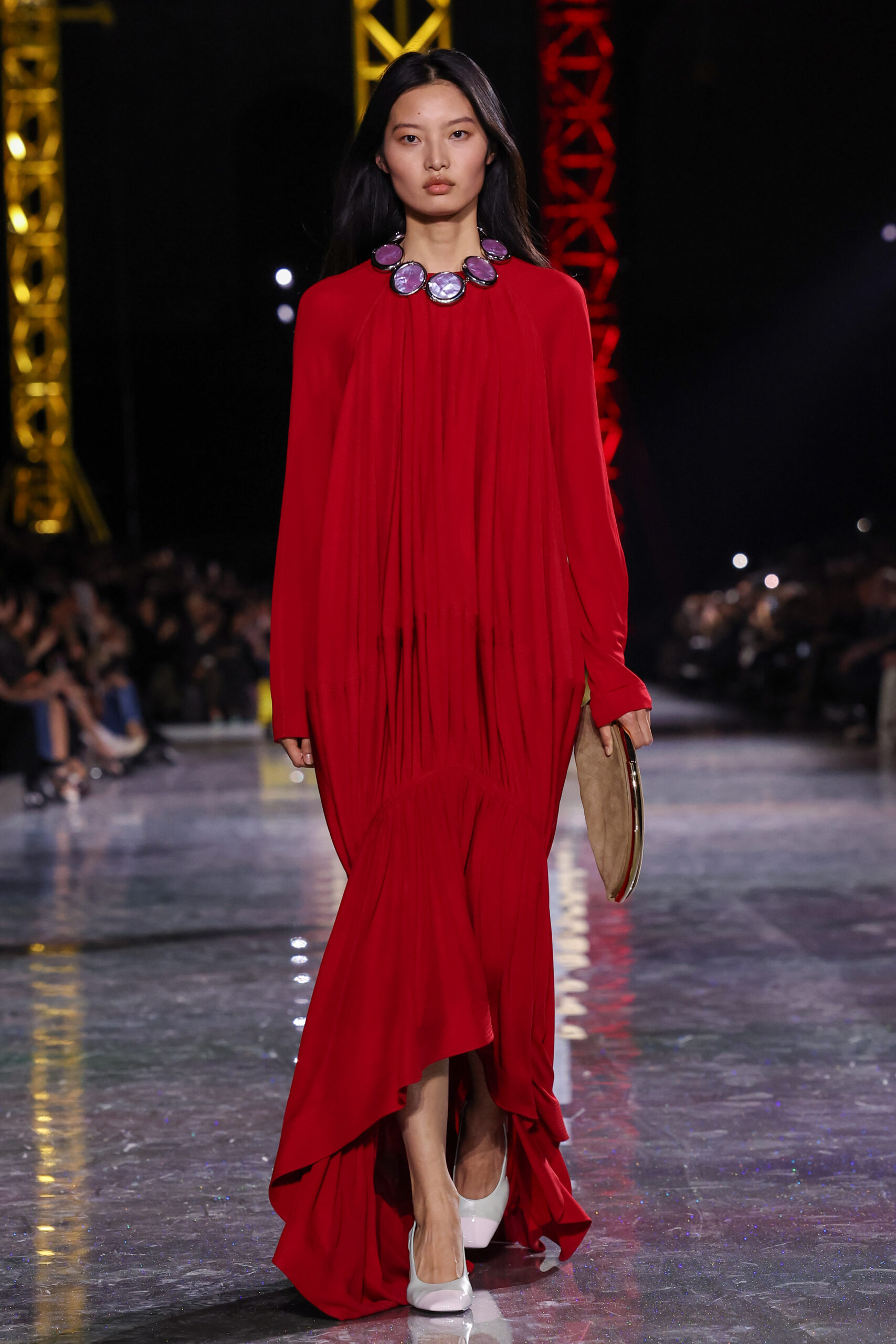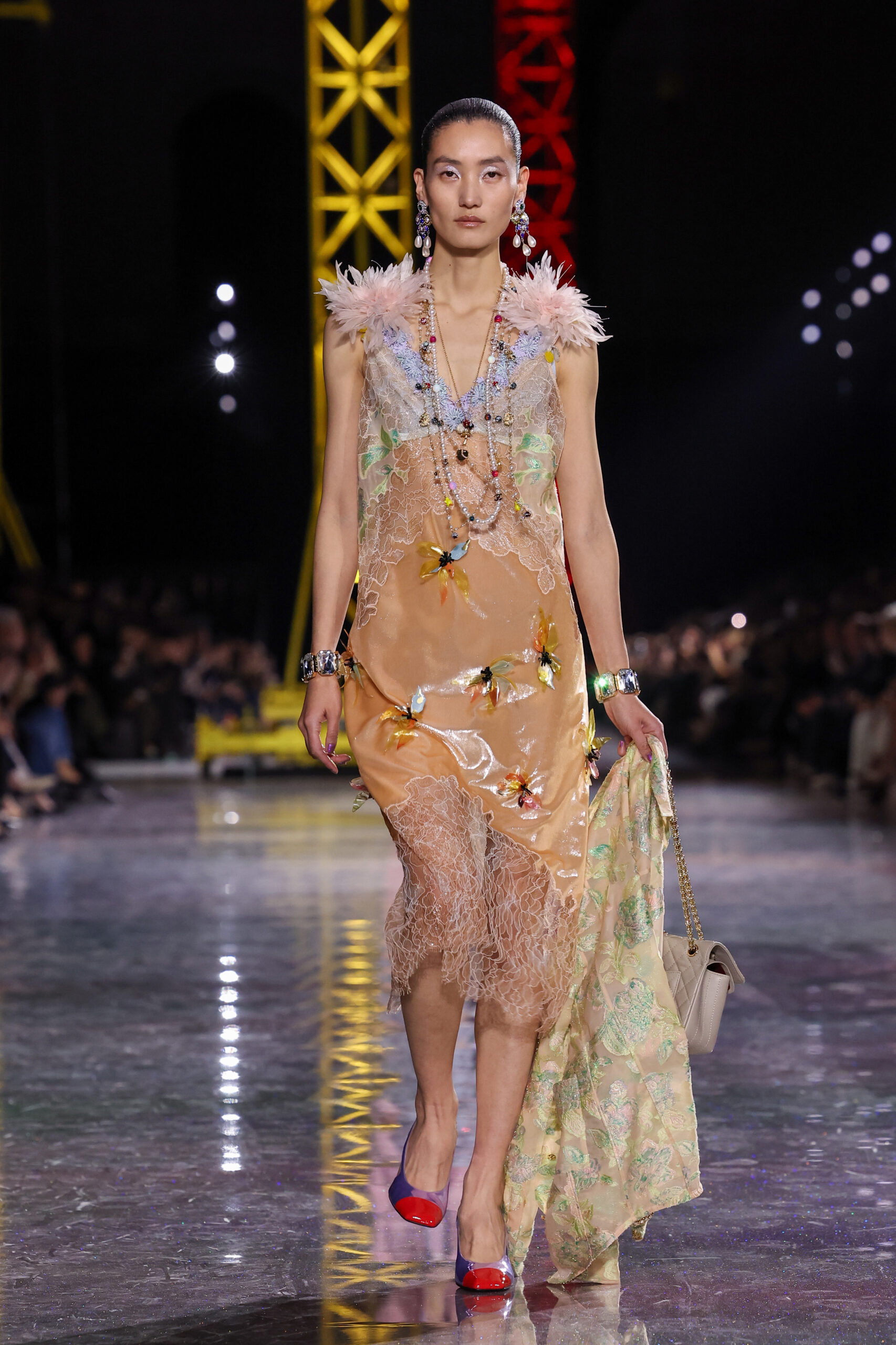 By nightfall (at least sartorially), the butterfly had well indeed emerged. Streamlined coats, sinuous dresses and iridescent embellishments glimmered under the lights, while enamel jewellery, pastel second-skin boots and playful minaudières added a surreal, almost Impressionist sheen.