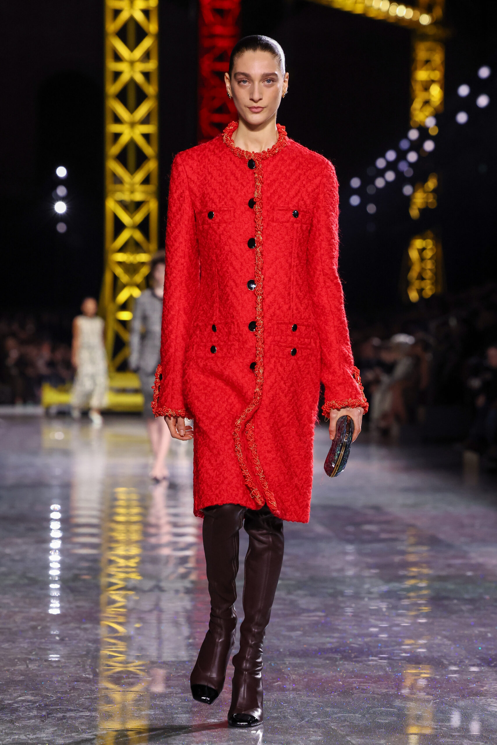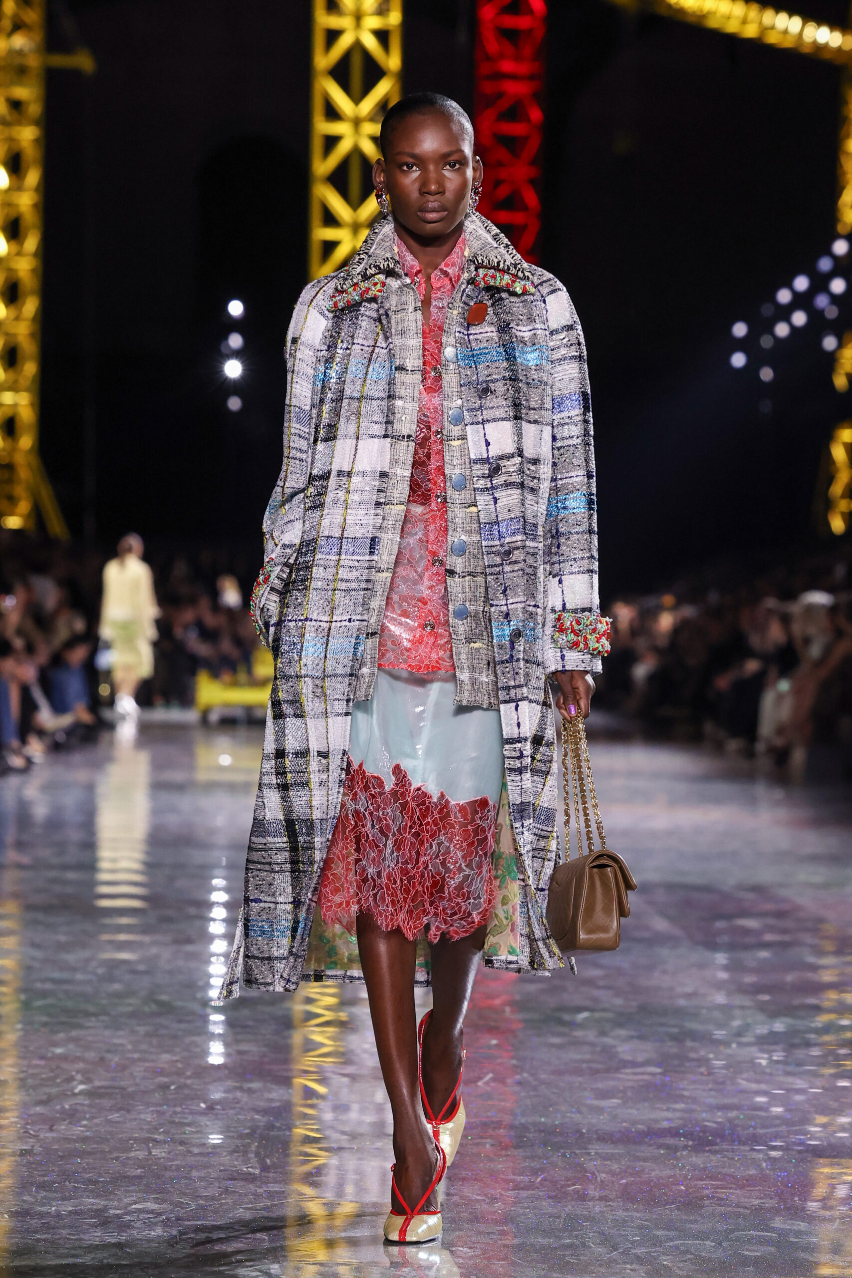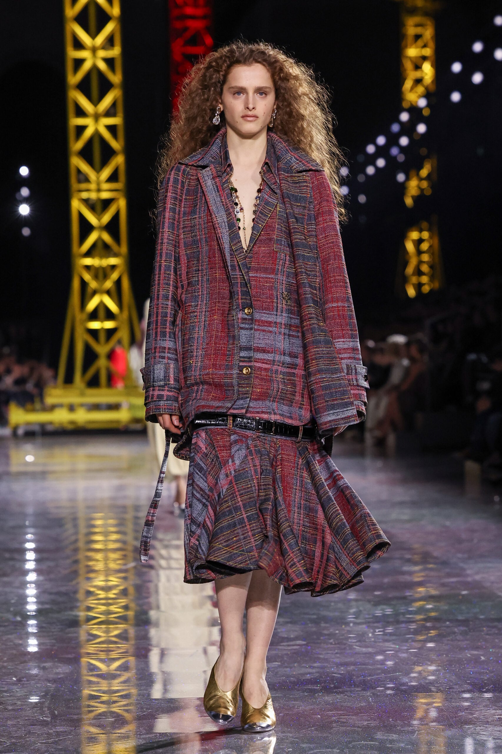 Blazy began with the House’s most reliable instrument: the Chanel suit. But here it was loosened, stretched, and reimagined in a language that felt both archival and futuristic. Ribbed knits replaced rigid tailoring; tweeds were threaded with lurex and even silicone; bouclé work shirts and masculine blousons suggested a wardrobe that could drift easily between settings and time. These silhouettes traced a loose path through the Maison’s history, with echoes of the twenties and thirties, then the mid-century decades, before circling back to the present.