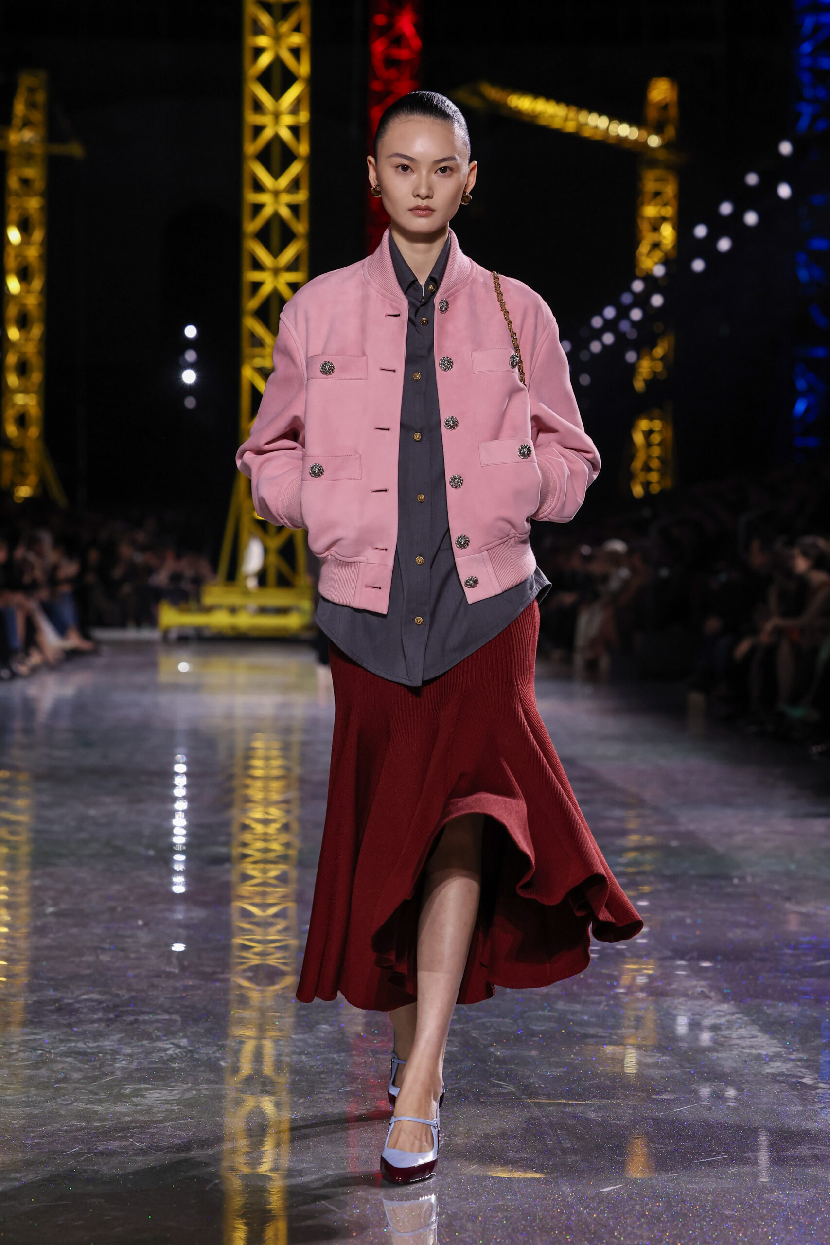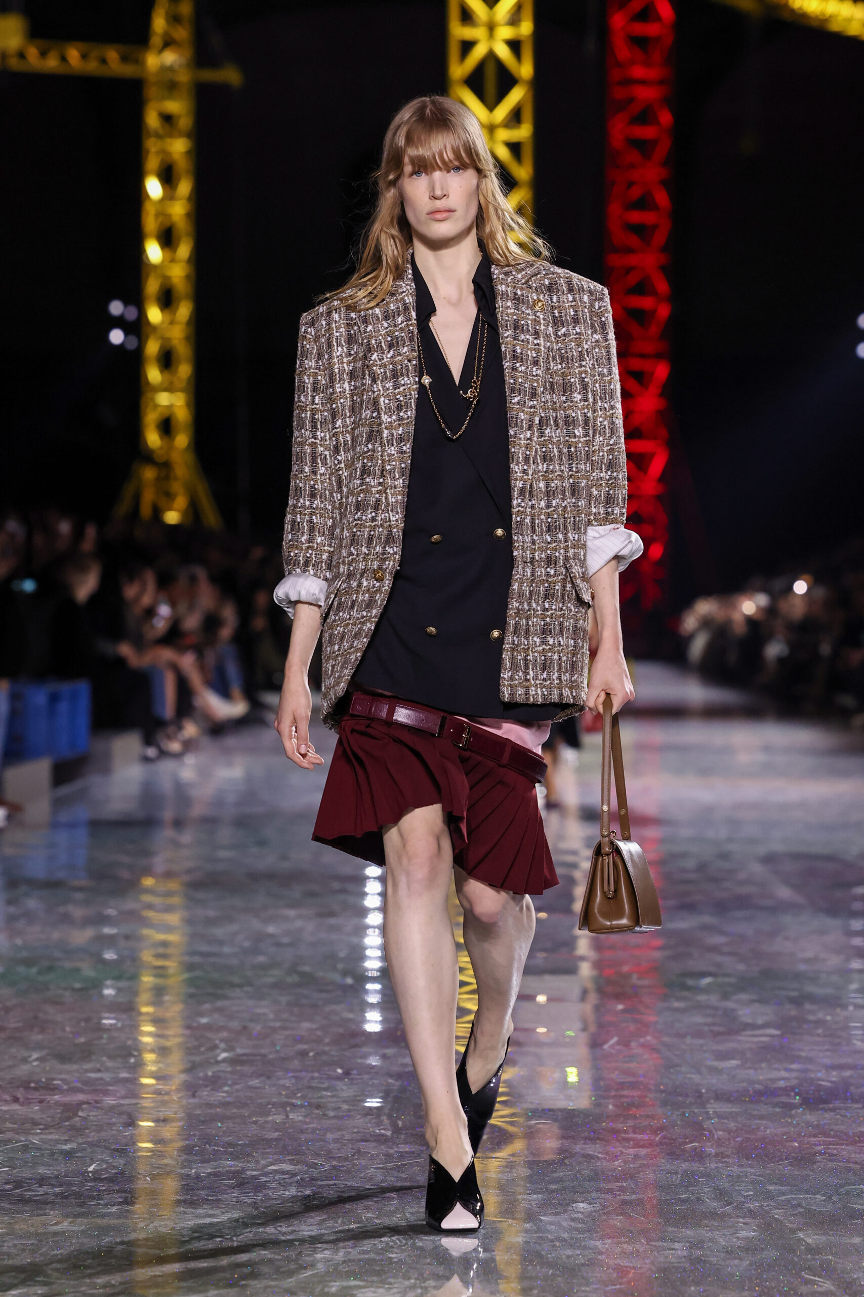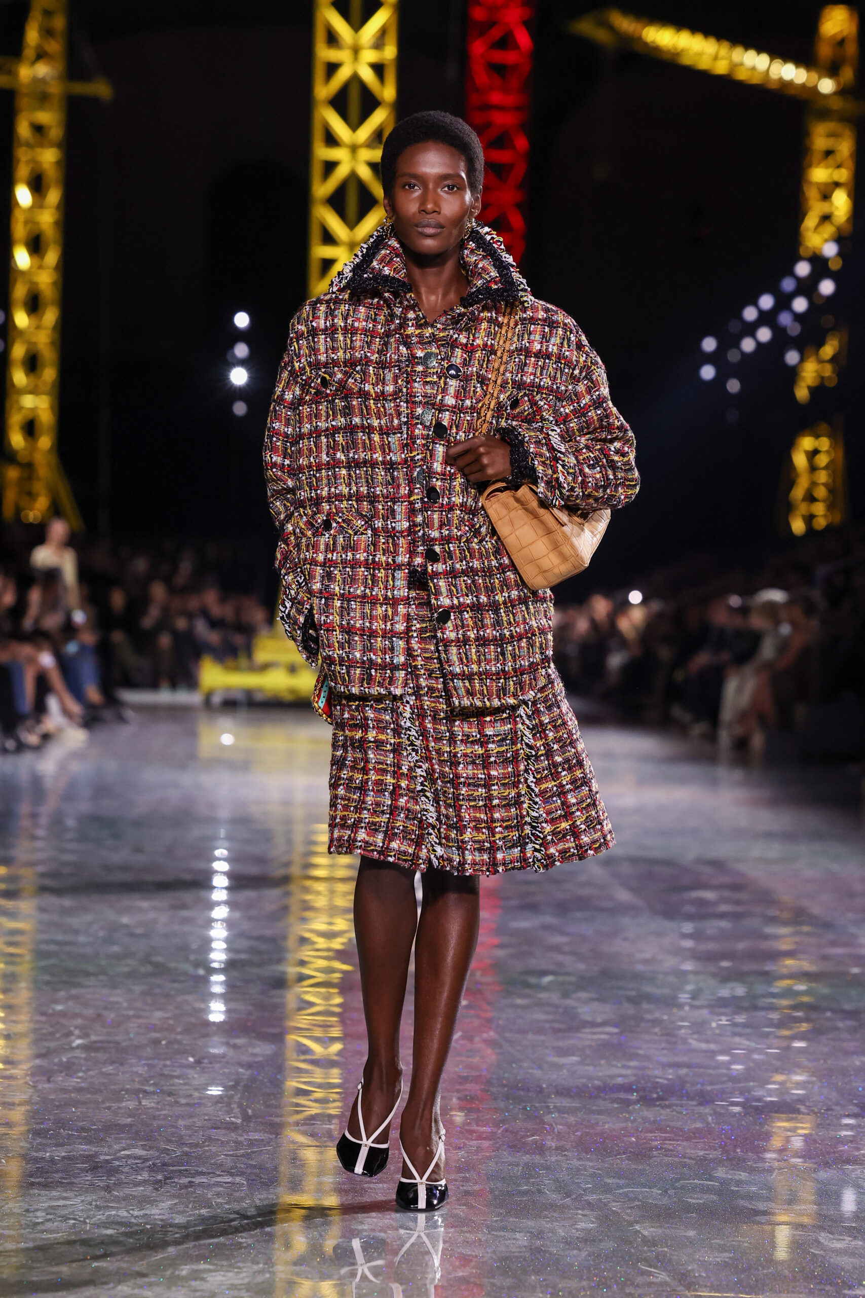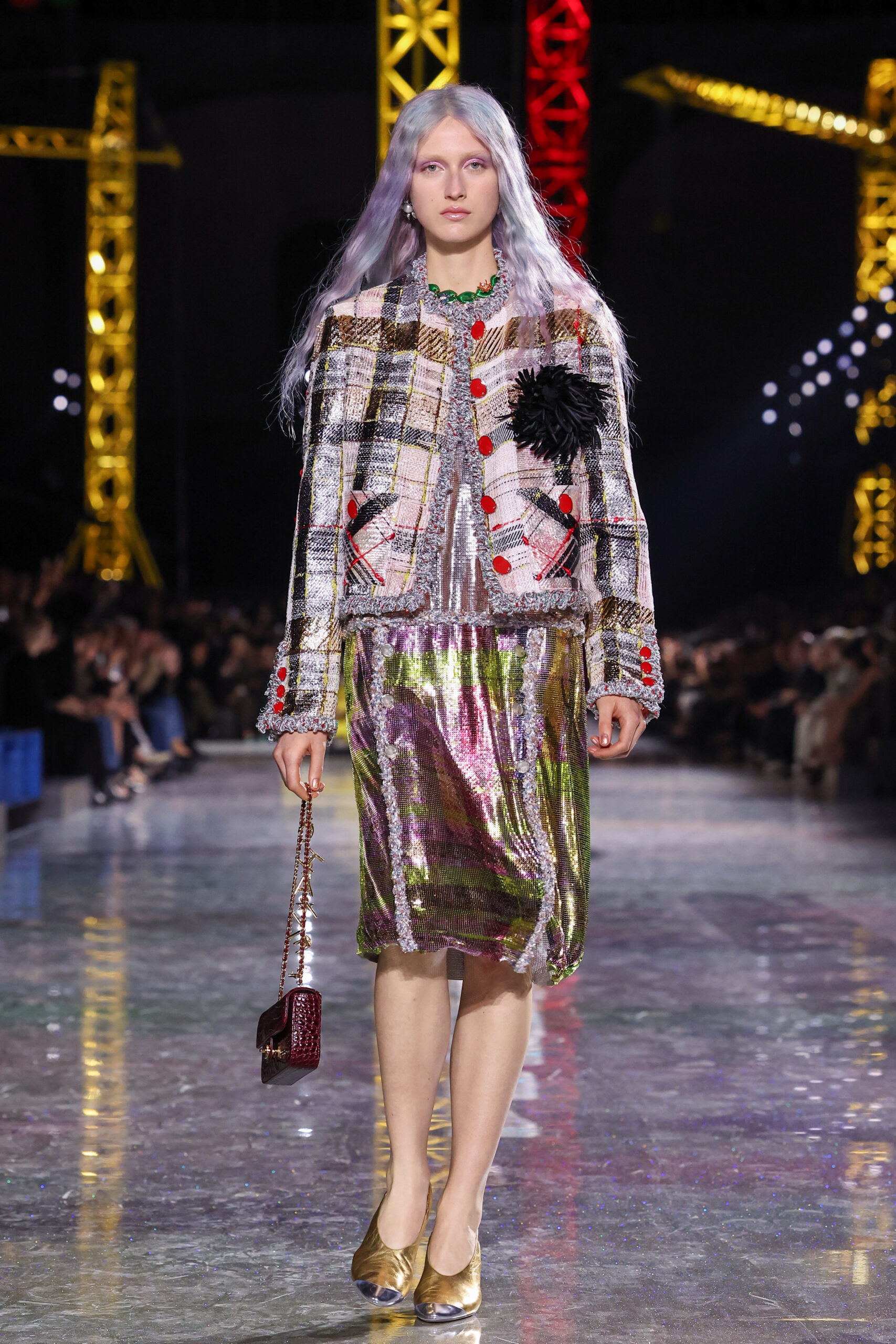 Blazy began with the House’s most reliable instrument: the Chanel suit. But here it was loosened, stretched, and reimagined in a language that felt both archival and futuristic. Ribbed knits replaced rigid tailoring; tweeds were threaded with lurex and even silicone; bouclé work shirts and masculine blousons suggested a wardrobe that could drift easily between settings and time. These silhouettes traced a loose path through the Maison’s history, with echoes of the twenties and thirties, then the mid-century decades, before circling back to the present.