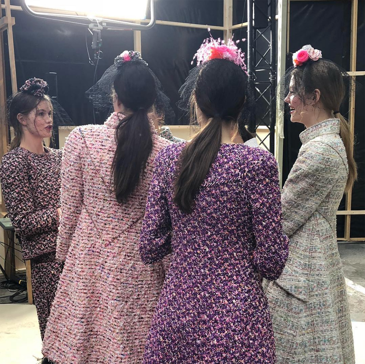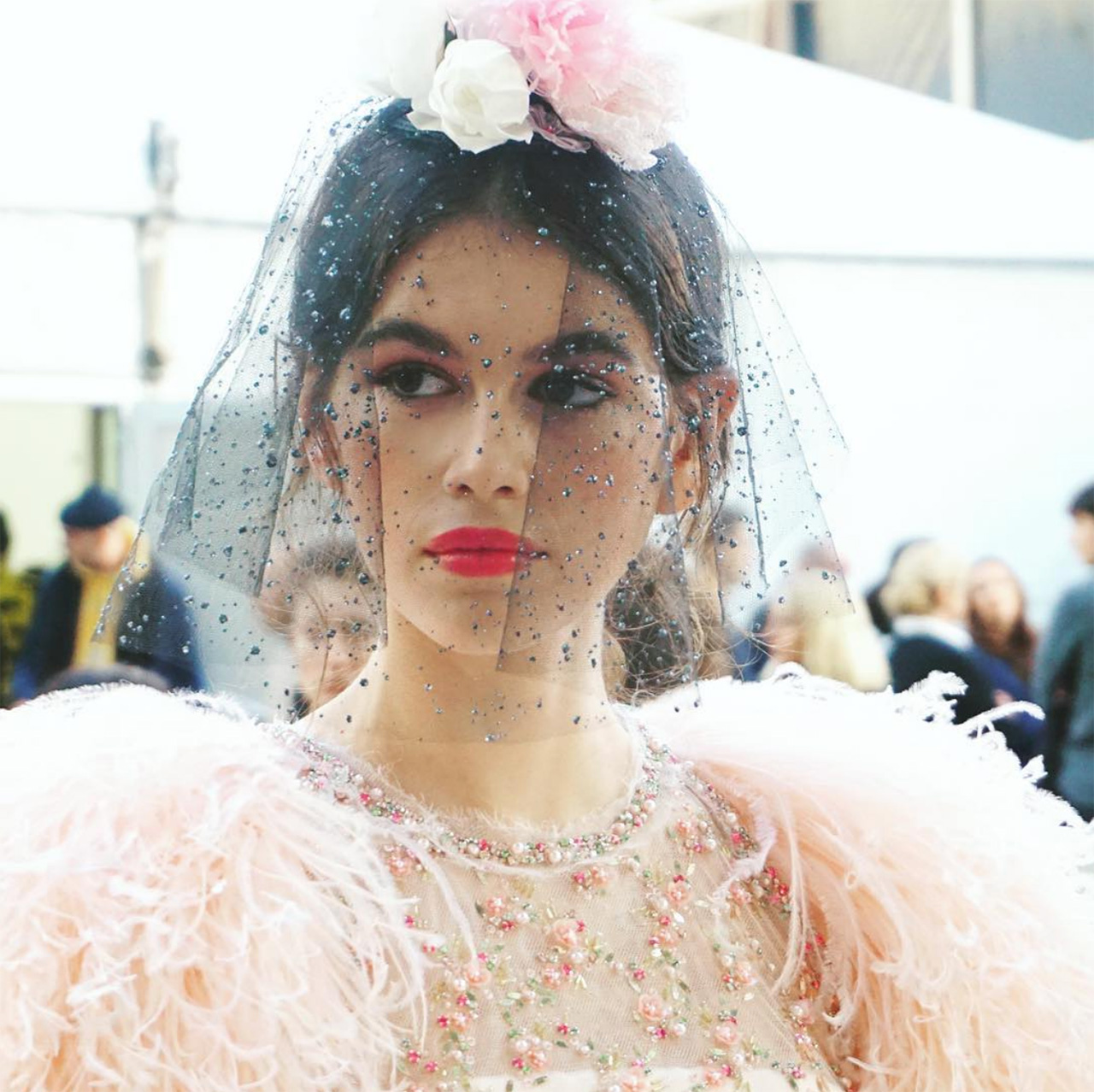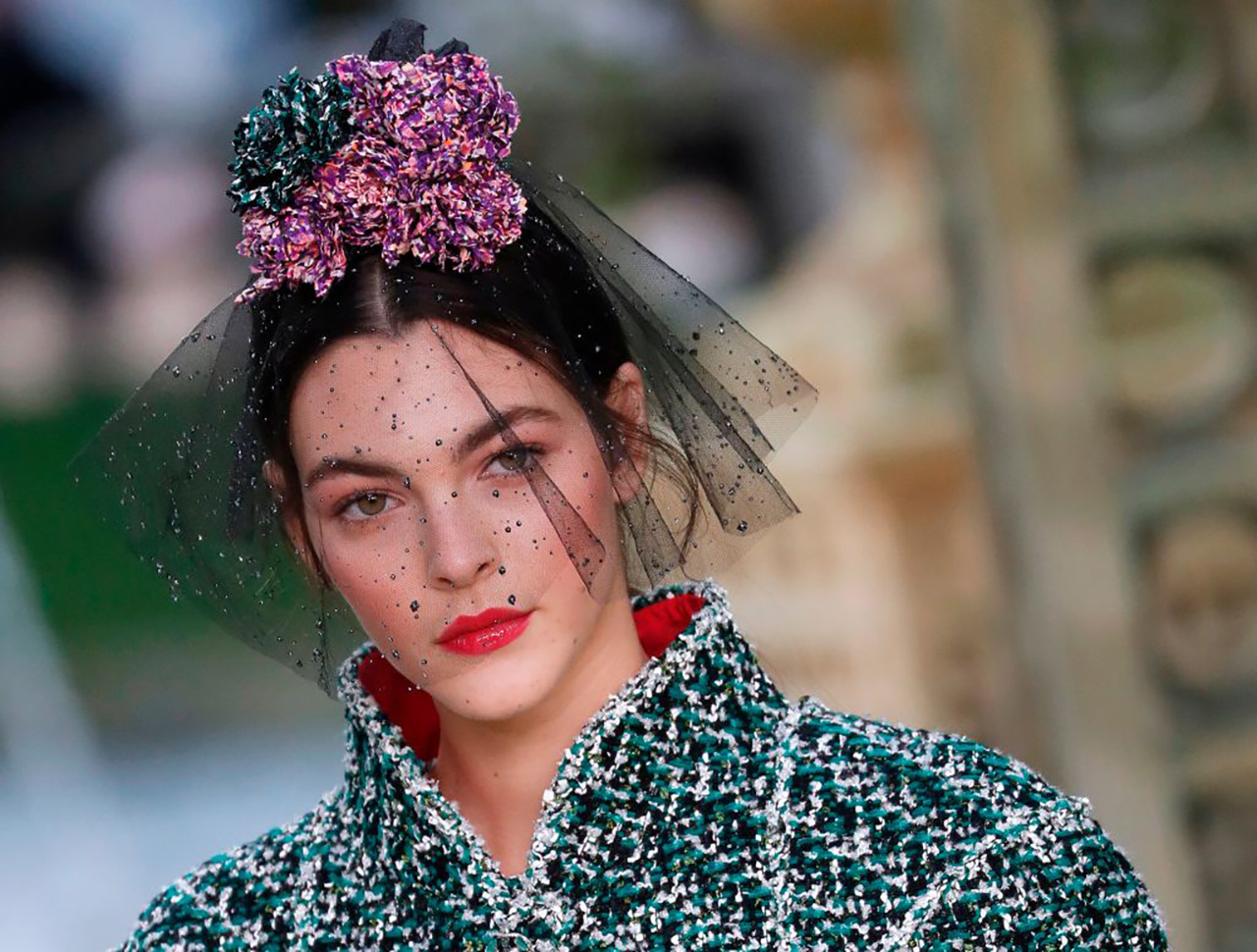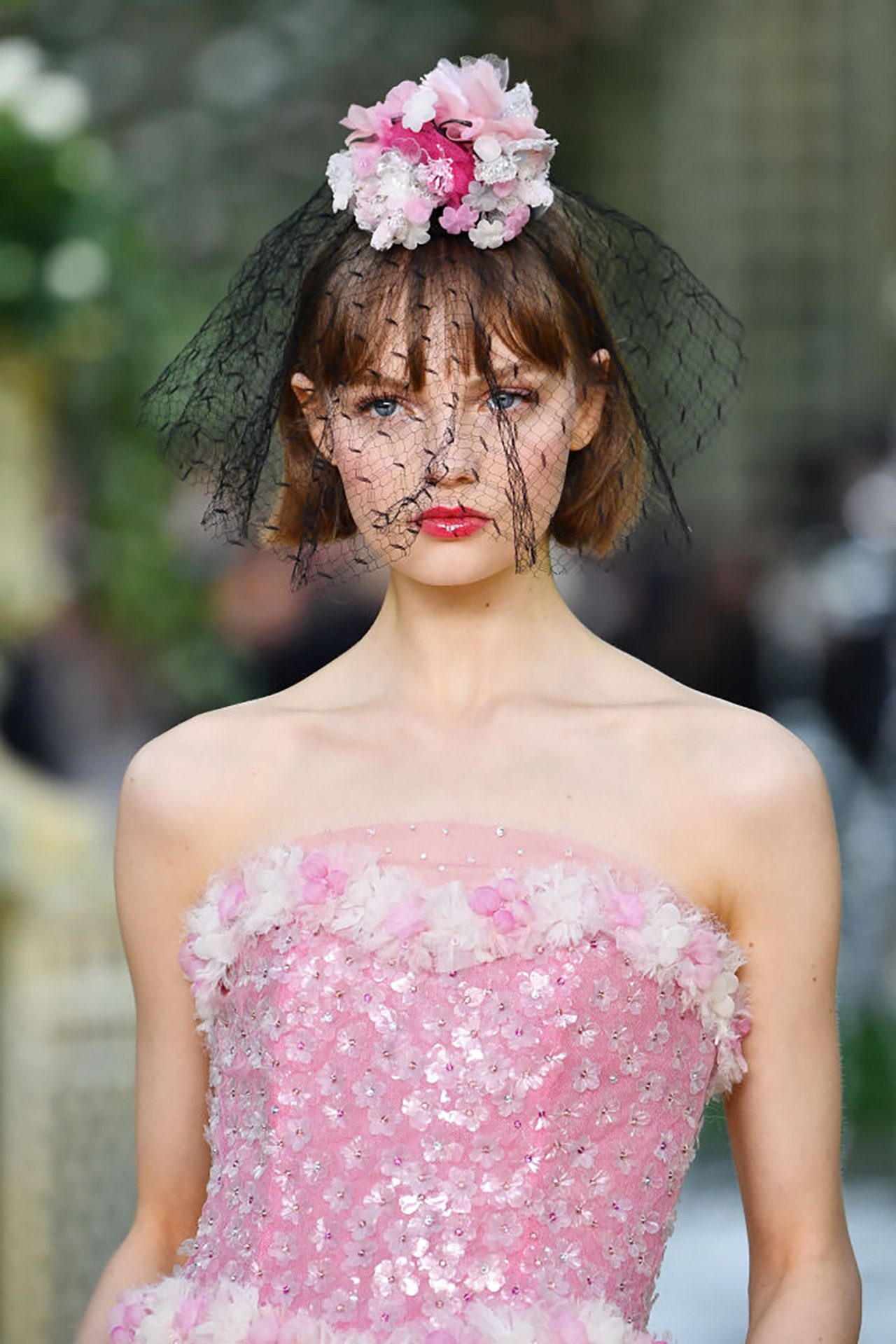 Veils in cobweb-like lace, embellished mesh, layers of tulle; it was whimsical and suitably romantic, virginal brides walking down the rose-lined runway in pastel Chanel confections. And the icing on the cake? Petit bouquets of silk roses, shirred tweed, marabou feathers, even Perspex (an ode to the previous Chanel show, perhaps), all huddled with height atop model heads. Soft and tender, it was the perfect adornment in Karl’s Garden party.