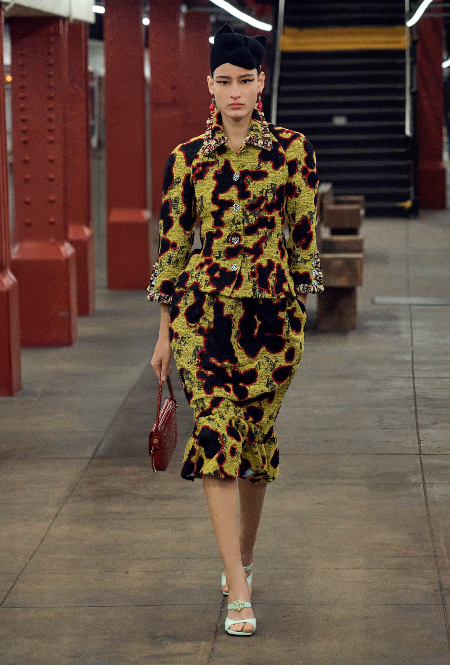 Characters materialised everywhere in a leopard-tweed cat lady (or cat woman), a polished urbanite with a gilded alligator–illusion flap bag, and a woman gliding by in a 1930s slip embroidered with shimmering fish by Atelier Montex. Through them, Blazy crafted a love letter between Paris and New York, penned through craftsmanship, humour, and a deep affection for the city that once helped Gabrielle Chanel rediscover her own creative spark.