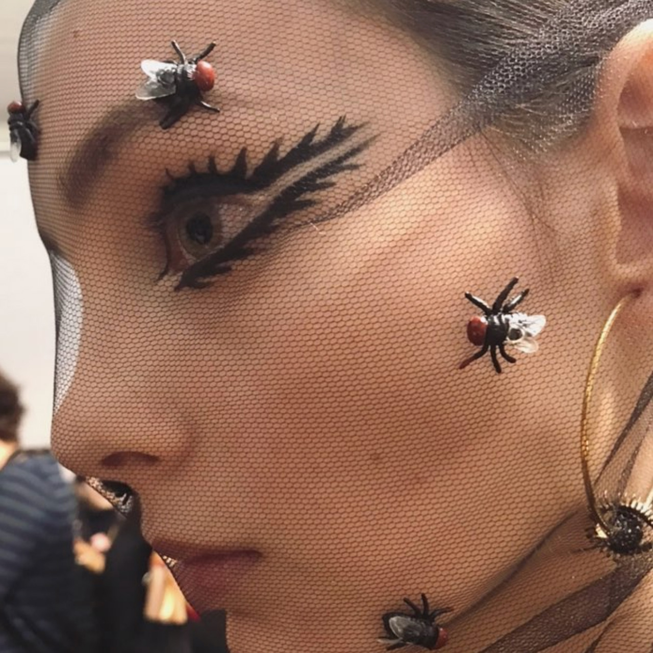 All the classic tropes were there – languid lines, ludic shapes, nonsensical silhouettes – and tropes signature to Chiuri’s Dior, namely transparency. But, in a slight deviation north, it was the makeup and millinery which really stoked the surrealist fire. In what was a kind of Dior Masquerade Ball, a handful of models wore surrealist veils created by British milliner Stephen Jones. So deftly articulated, that from the naked eye the masks appeared to be somewhat of an optical illusion, a puff of pixels shrouding model faces. But alas, it was the expert handiwork of Jones; a multi-layered overlay of tulle which revealed only the eyes. Some, were letterbox-like, obscurest felt squares with dramatic eyes peering through. Others, were embellished with three-dimensional flies; the juxtaposition of beady bug eyes against fine tulle a surrealist statement in itself.