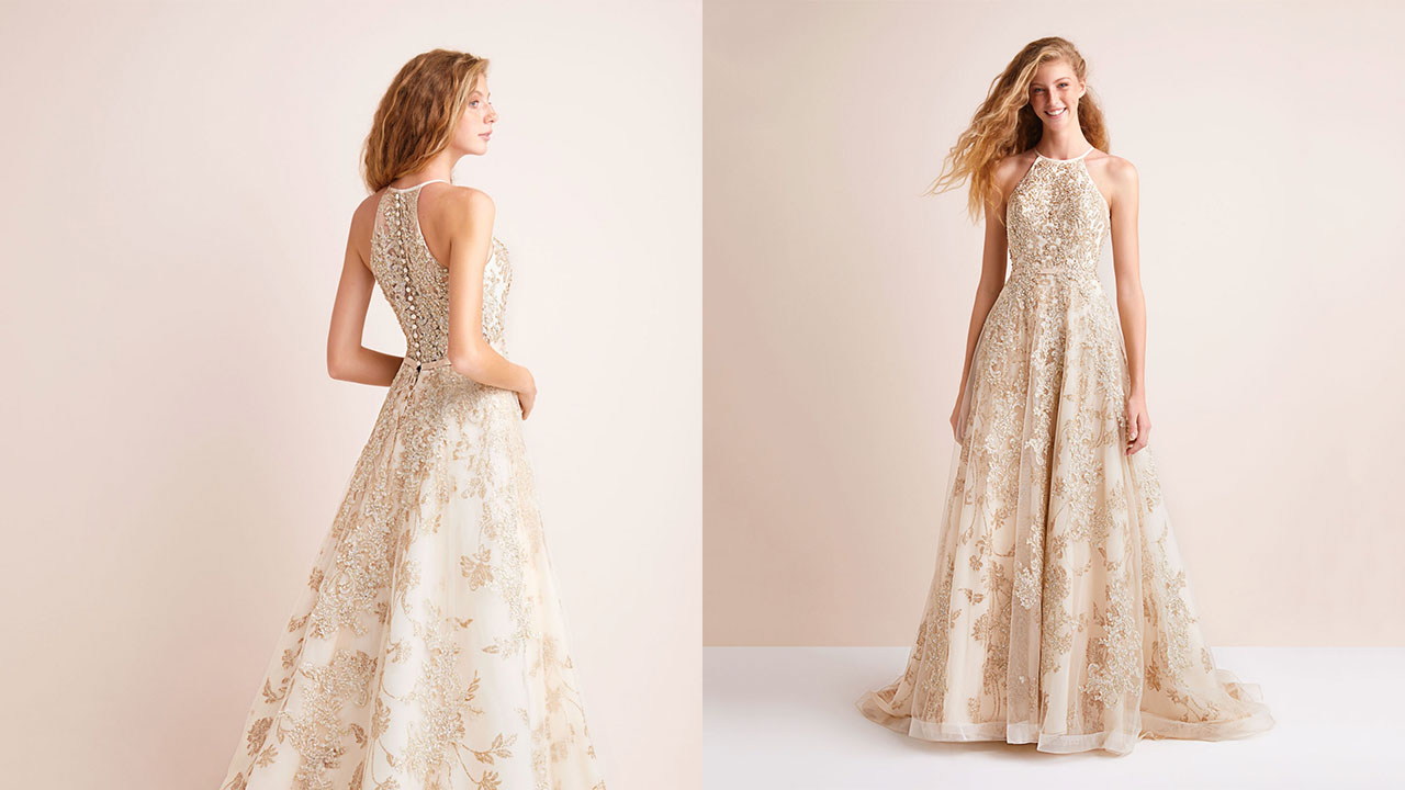 Oleg Cassini, all over lace applique halter ball gown, $1499. SHOP NOW