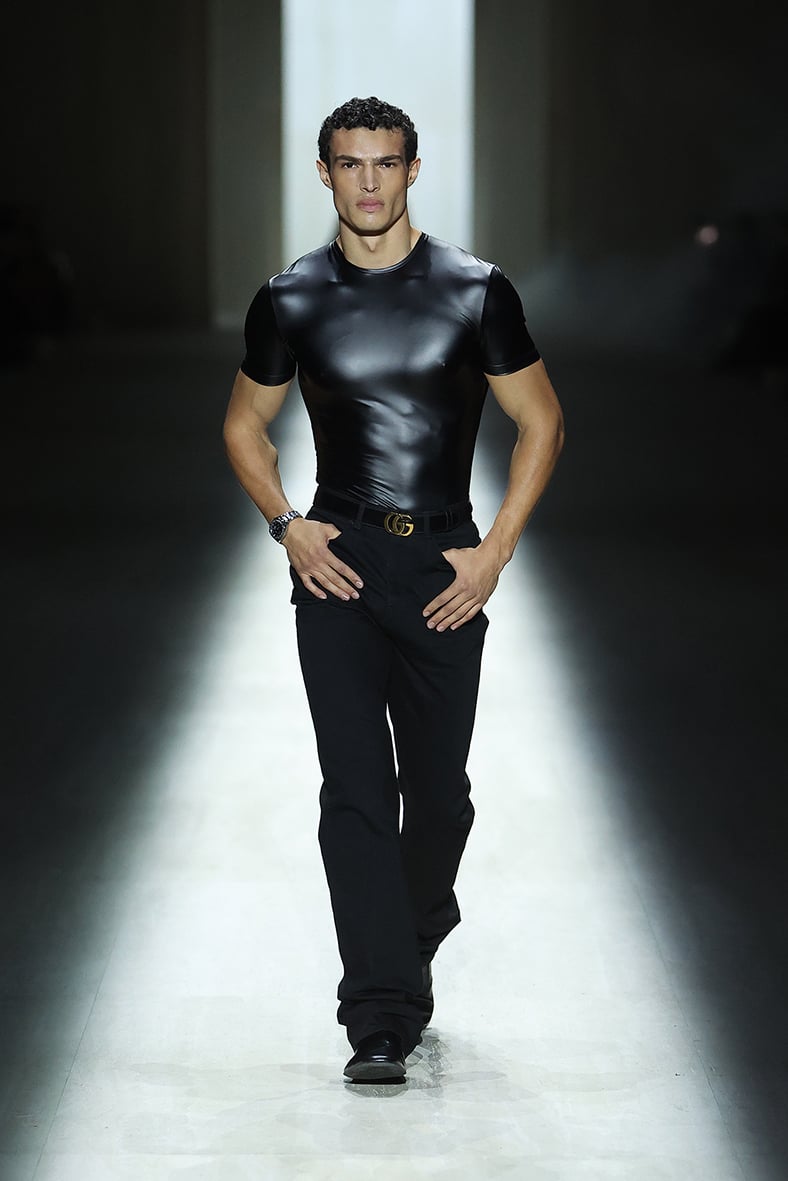 It opened with a palate cleanser: an ultimate seamless white turtleneck minidress in hosiery fabric that channelled the pure femme-fatale assurance of Sharon Stone in Basic Instinct. From there, body-clinging silhouettes engineered with invisible heat-sealed edges and curved hems, cut close in a way that felt like a fusion of both Gucci and Demna’s greatest hits. Jackets were cropped and snug, paired with pencil skirts and ab-baring trousers.