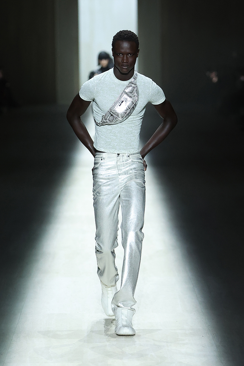 Demna’s perennial fascination with hybrid garments surfaced in tracksuit dresses, leggings fused to trousers, and jackets merged with tops into ultra-fitted one-pieces. Feathered bombers framed the face, while butter-soft leathers relaxed bikers and circular stoles. Eveningwear then tipped into decadence with waist-high slits and a backless dress revealing a diamond-studded white-gold GG thong.