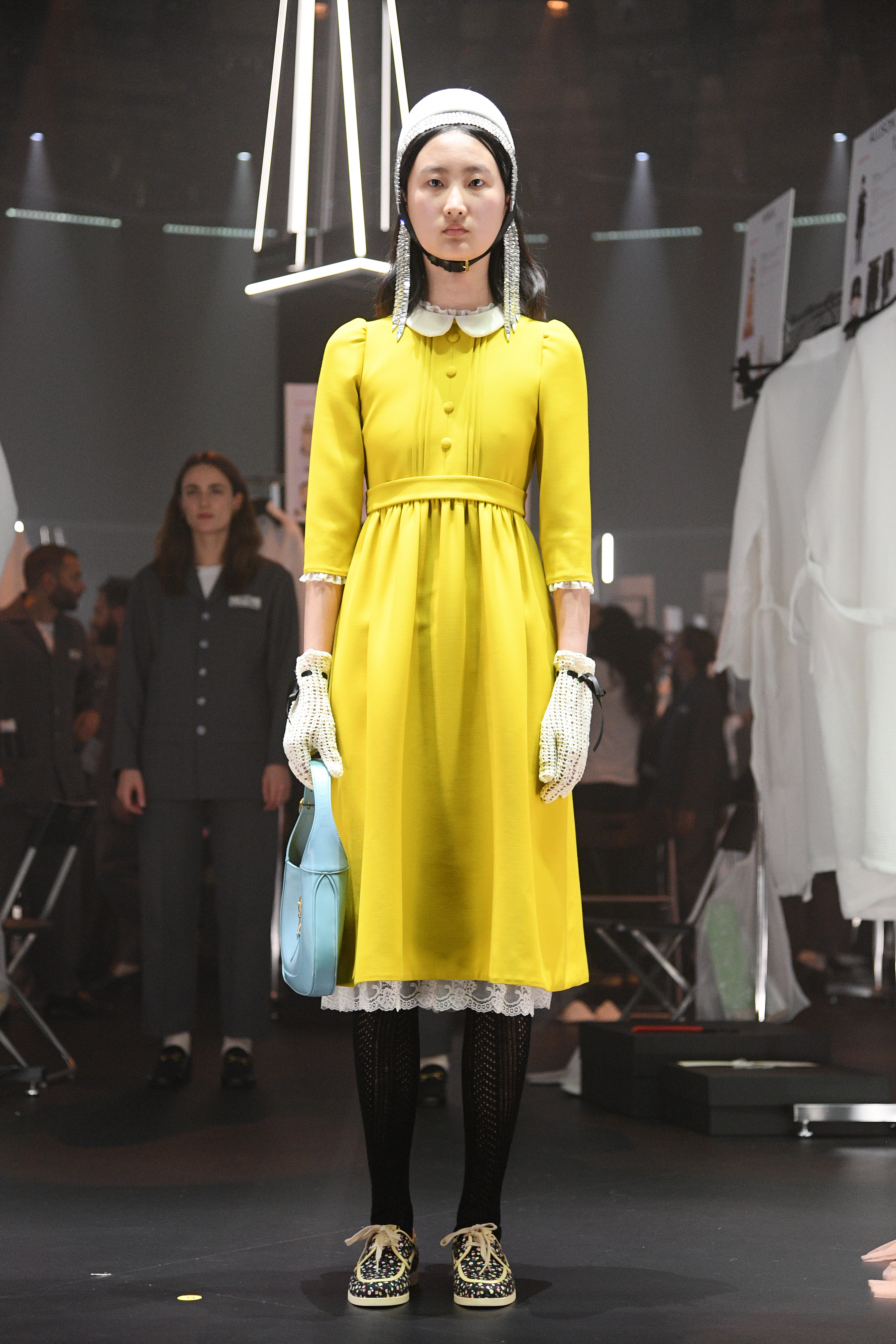 A few minutes later, the music intensified, the lights dimmed and the curtain dropped to show stylists in grey suits carefully putting together Gucci’s new season looks in front of the crowd: An unveiling of what’s behind the curtains, in both the figurative and literal sense.