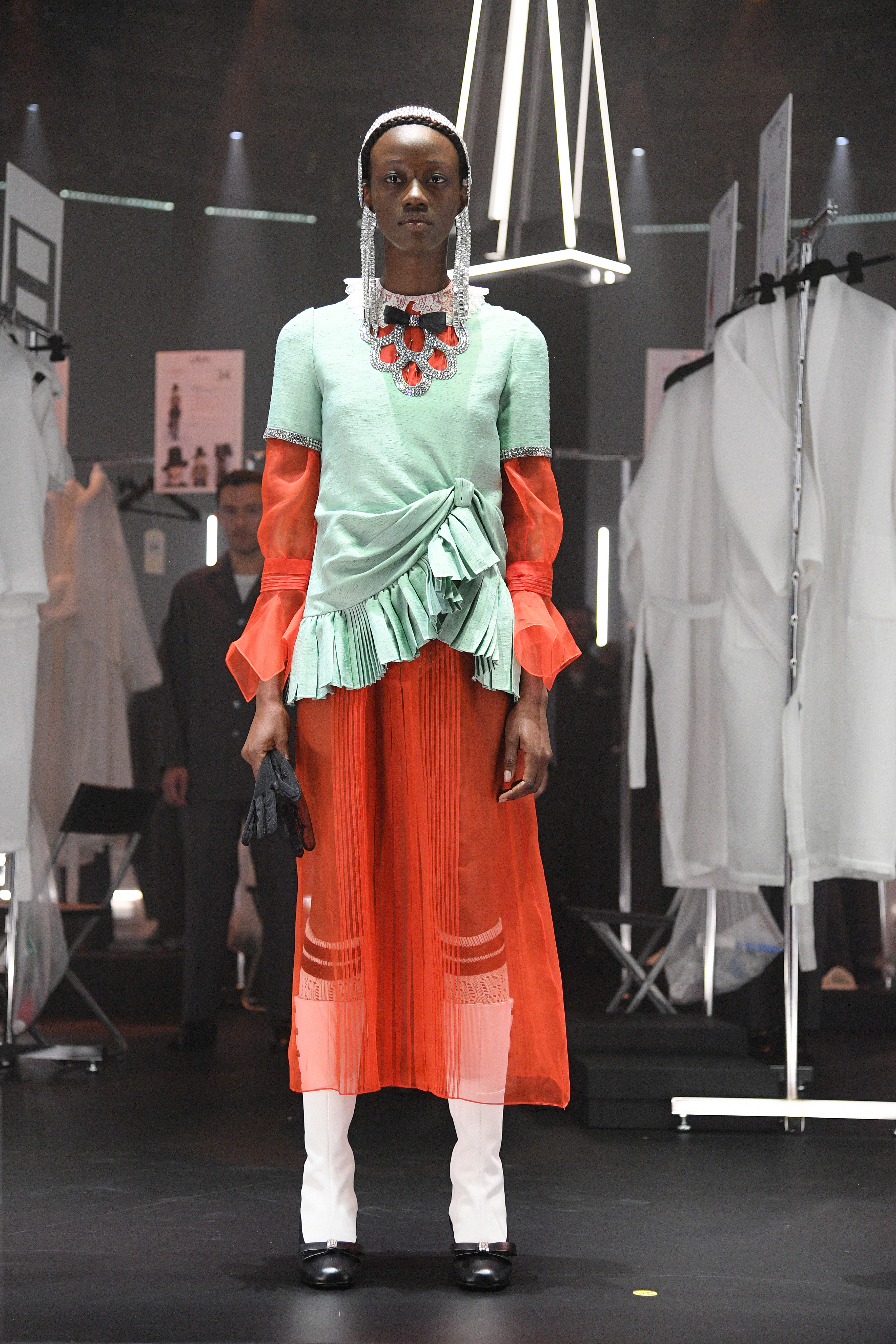 Filing through into a dark, smoky room, guests including Florence Welch, Sinead Burke and Yara Shahidi found their seats around a circular, pink curtain crowned by a neon-lit metronome marking time, before models filed through into the middle still wearing their white robes.
