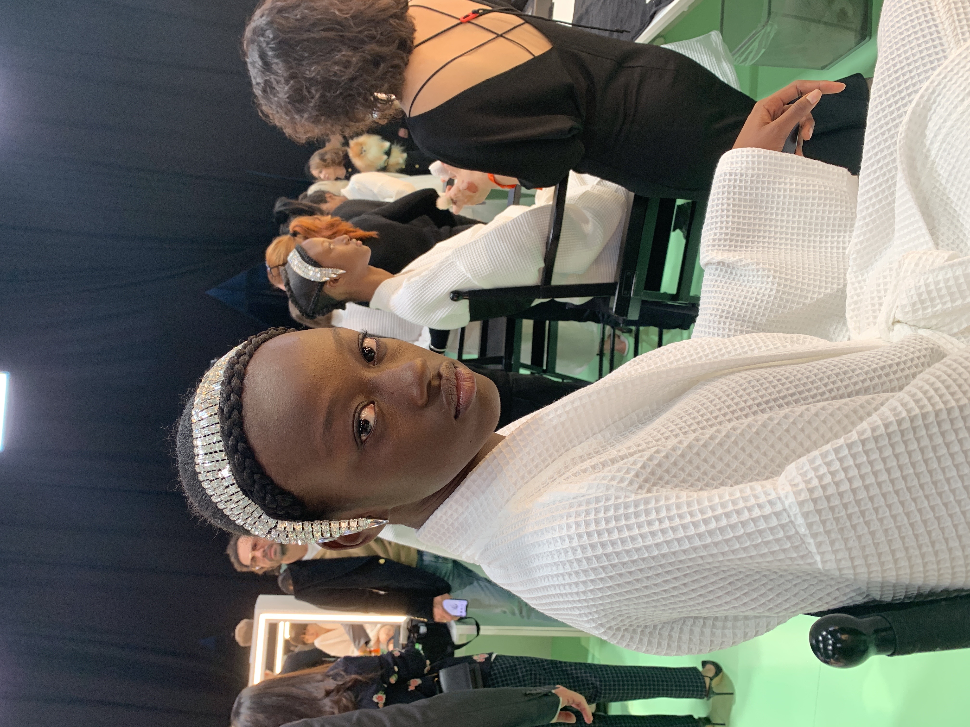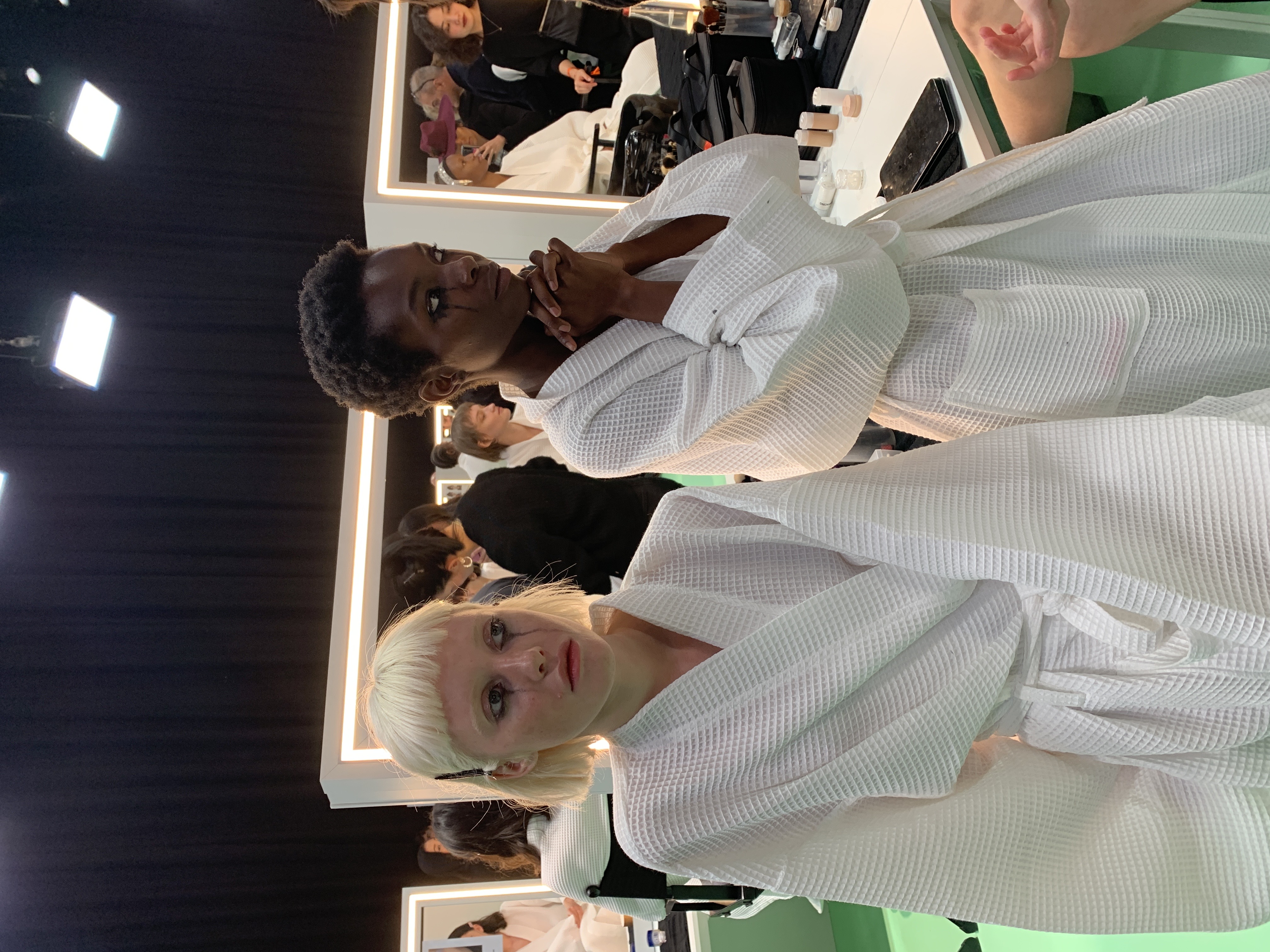 Moving inside the Gucci Hub, it felt as though we’d taken a wrong turn, ending up in the backstage area as robed models sat at stations having their hair and makeup done. The only assurance that we were meant to be seeing the inner workings of the show? Michele slowly moving through to greet attendees as they filmed close-ups of the gothic-inspired make-up looks: