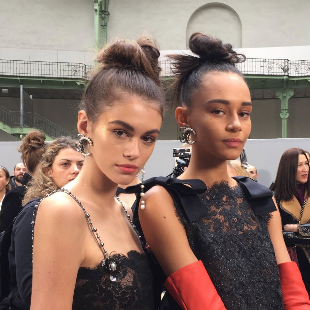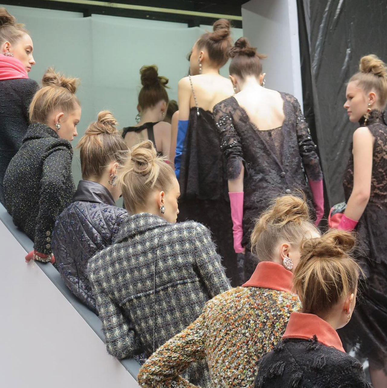 And it did. Hair was twisted with little effort and a lot of blasé into annoyingly (imperfect) perfect top knots. Perfect because they were wearing Chanel, perhaps, but the youthful, almost punk-like twists were polished at the root – raked all the way off the face with little product – then pokey at the ends – spurting tuffs of hair with irreverent glee (and a lot of Modern Hairspray). Some were affixed with CC logo crystal brooches (not so irreverent), others with perspex flowers (getting warmer), whilst others were laid bare (that’s the spirit), just a humble hair elastic keeping their buns tight. Tight buns which sat erect and high, reaching the hair heavens, “The shoes were flat, so the hair went high!” McKnight exclaimed.