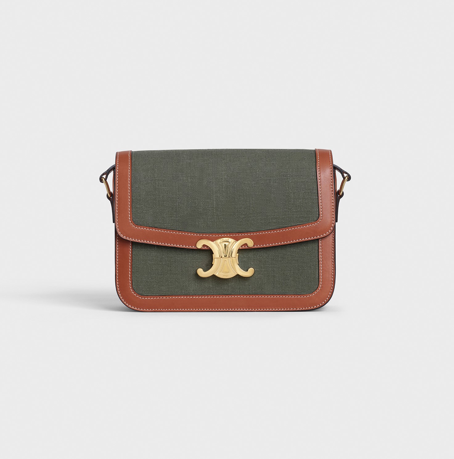 MEDIUM TRIOMPHE BAG IN KHAKI TEXTILE AND TAN CALFSKIN – HKD 26,500