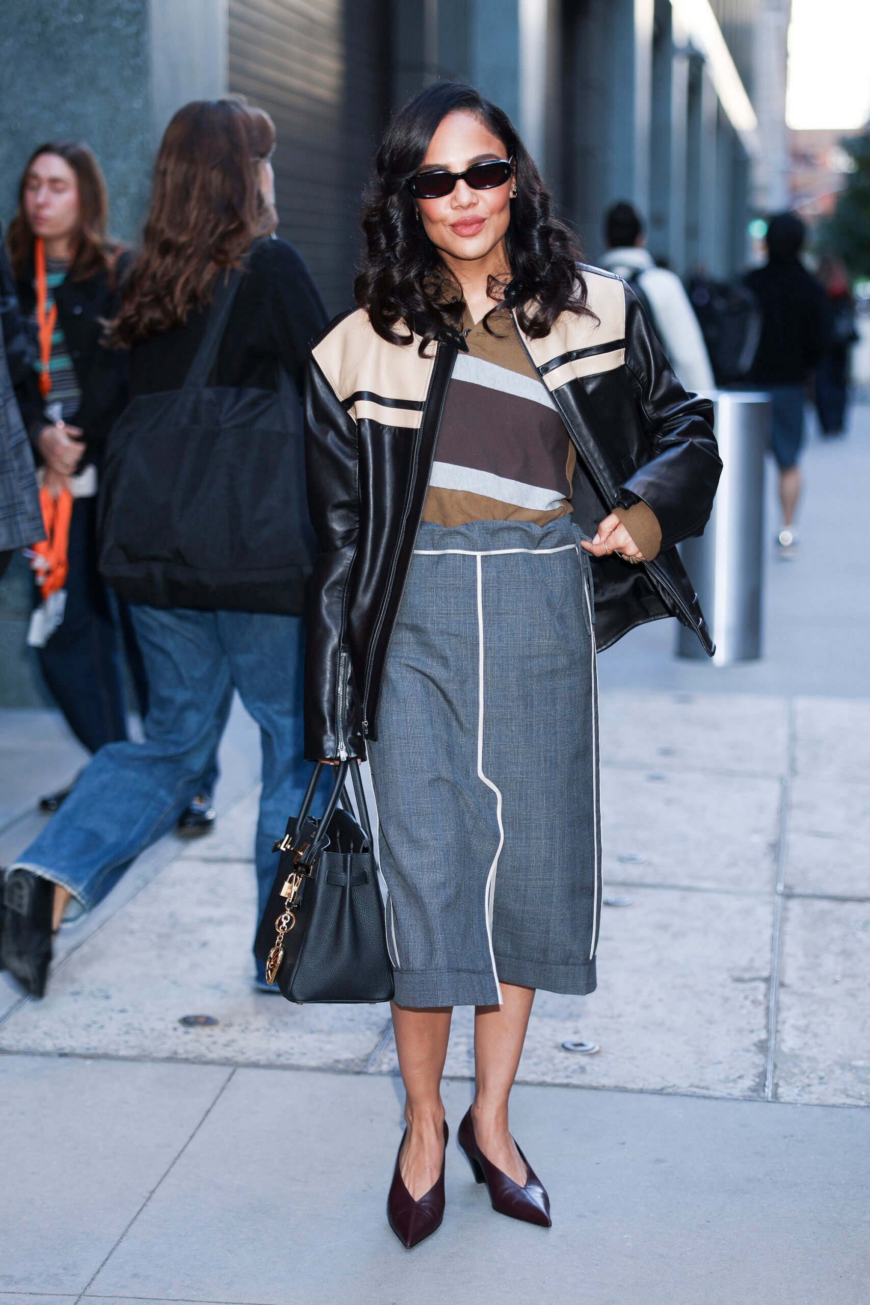Her first stop of the day was a study in offbeat prep. Wearing Commission’s Spring 2026 collection, Thompson paired a striped rugby shirt with a check grey skirt piped in white, topped with a leather moto coat that blended collegiate polish with street-style edge.
