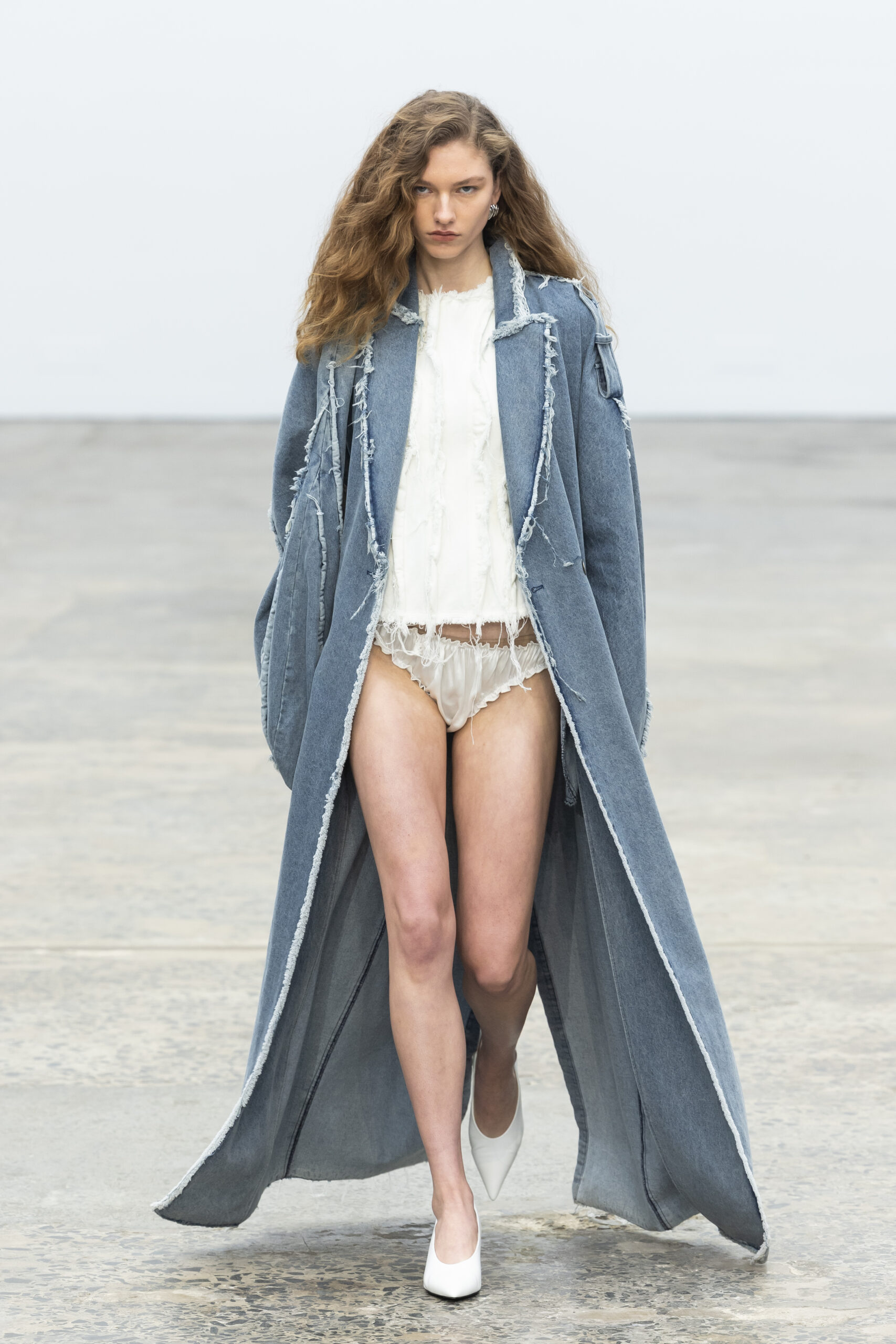 The first look of any runway show sets the tone, a prelude to what audiences can expect. At Third Form’s Resort 2025 spectacle on May 15, this came packaged as a long denim trench—open, faded, its seams purposefully frayed.