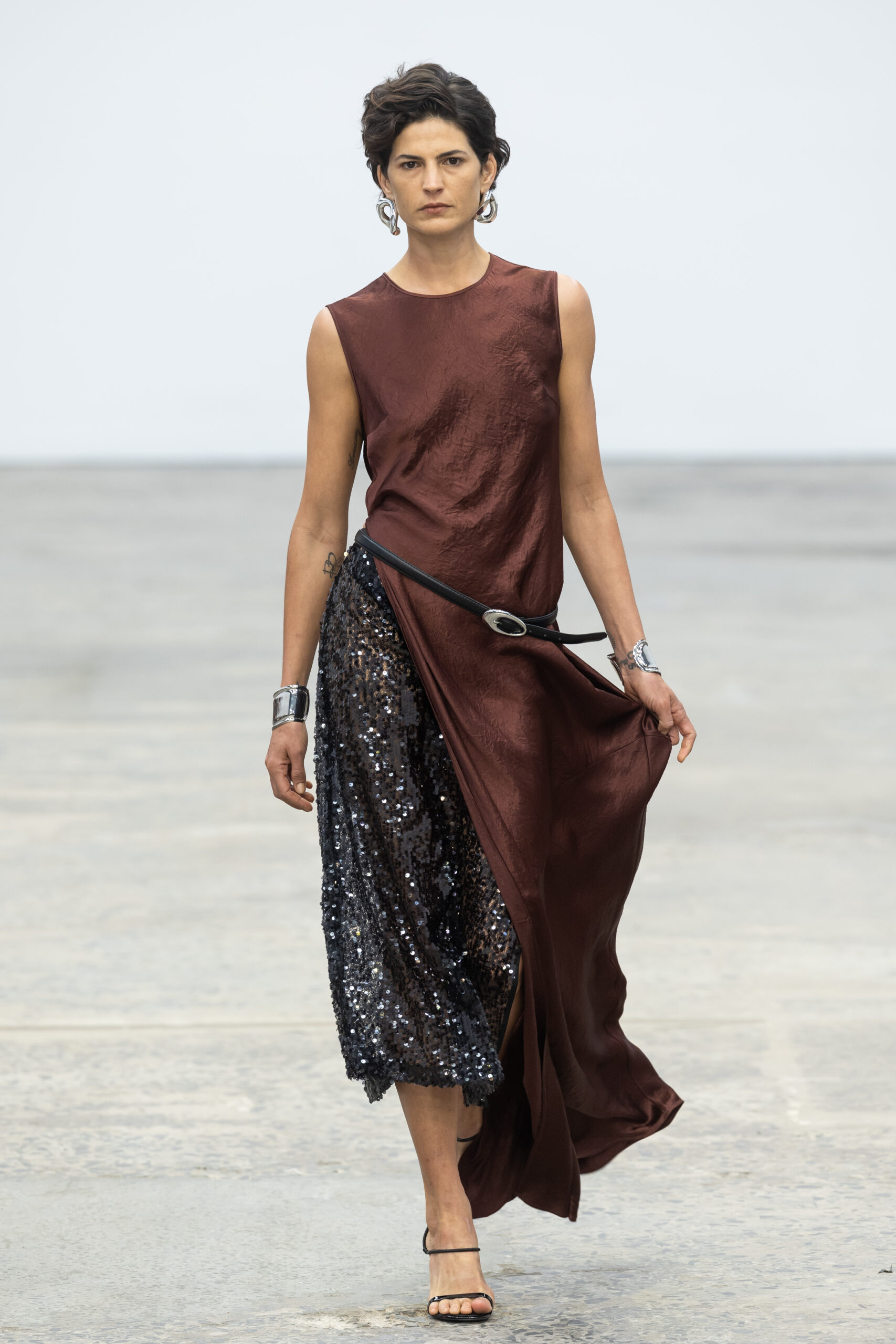 The scrunched panties were next seen under a peach-hued diaphanous sequinned gown, and then a floor-length cream satin dress with a waist-high split. Elsewhere, black cut-outs were aplenty: a mini with fringing, a translucent maxi. In a largely neutral palette, monochrome took centre stage by way of halter midis, crops with fringing, and a strapless top-and-short combo, the latter the true star of the Re-Form season. The brand’s renowned crushed satin range, ‘CRUSH’, was also reimagined into new, wearable silhouettes for summer. With full traceability from tree to fibre, the ‘CRUSH’ collection is made using Eastman NaiaTM cellulosic fibres that are certified biodegradable and compostable.