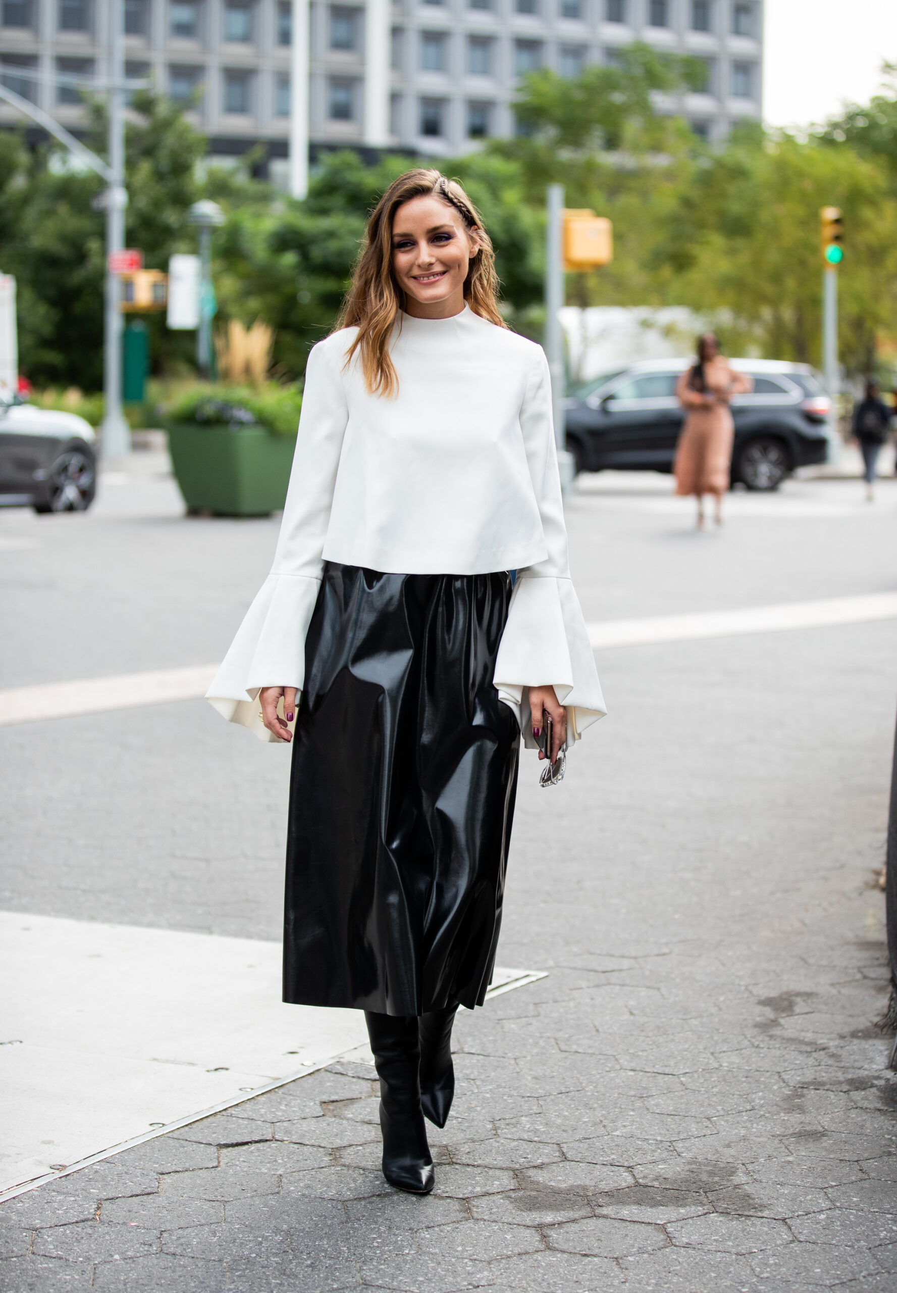 Una forma más formal de combinar la falda midi de piel es integrarla con un blazer oversize y una camisa. El contraste entre ambos estilos resulta exitoso. La camisa, por su parte, introduce líneas definidas que aportan orden al conjunto. En términos del color, la elección de tonos complementarios o neutros facilita la cohesión, permitiendo que la falda mantenga su protagonismo sin competir con el resto de las piezas.