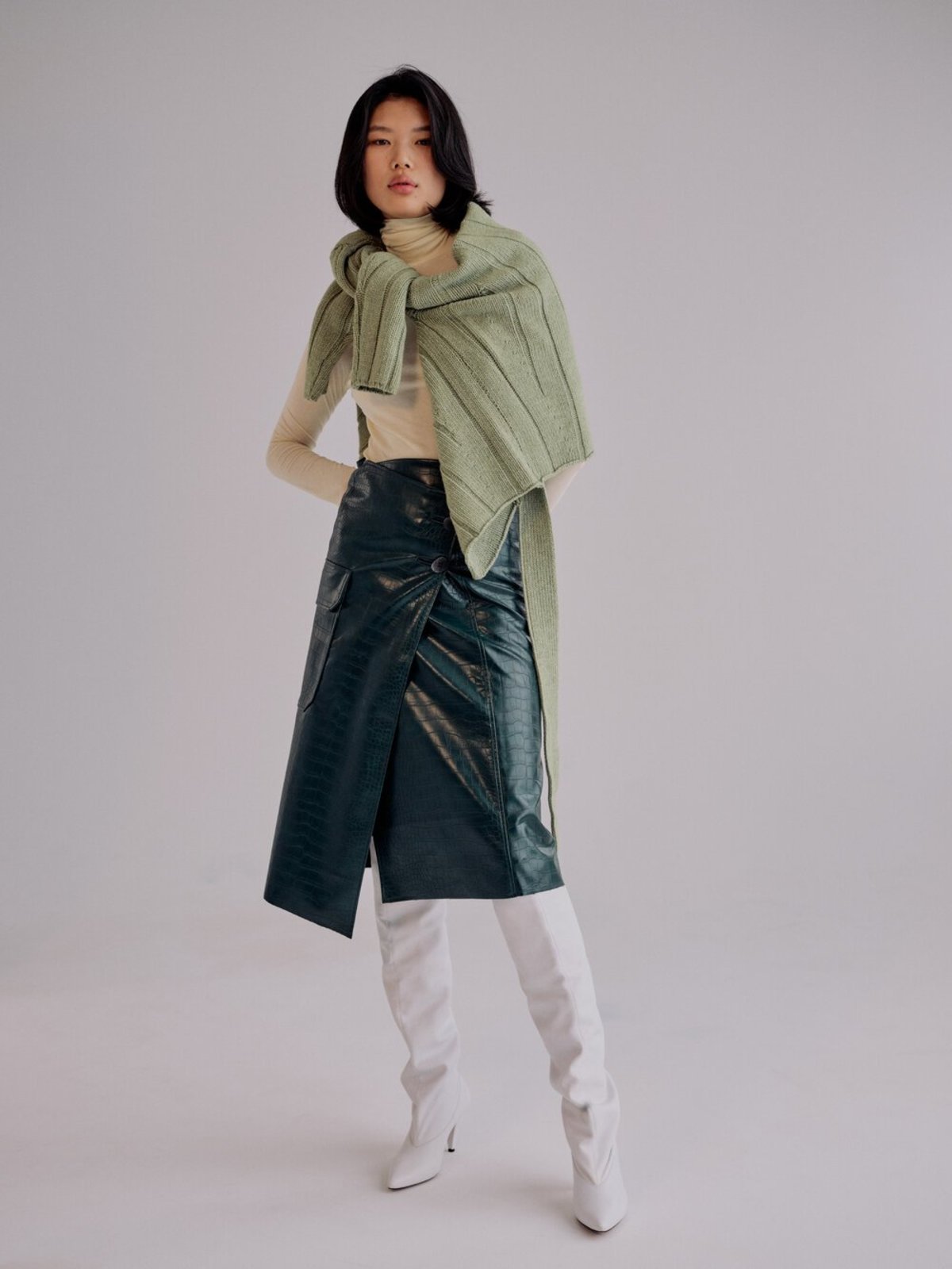 Una alternativa funcional para días de clima más frío consiste en combinar la falda midi de piel con un sweater y una bufanda amplia. El sweater genera una línea definida en el torso, mientras que la bufanda aporta textura al mismo tiempo que estarás abrigada.