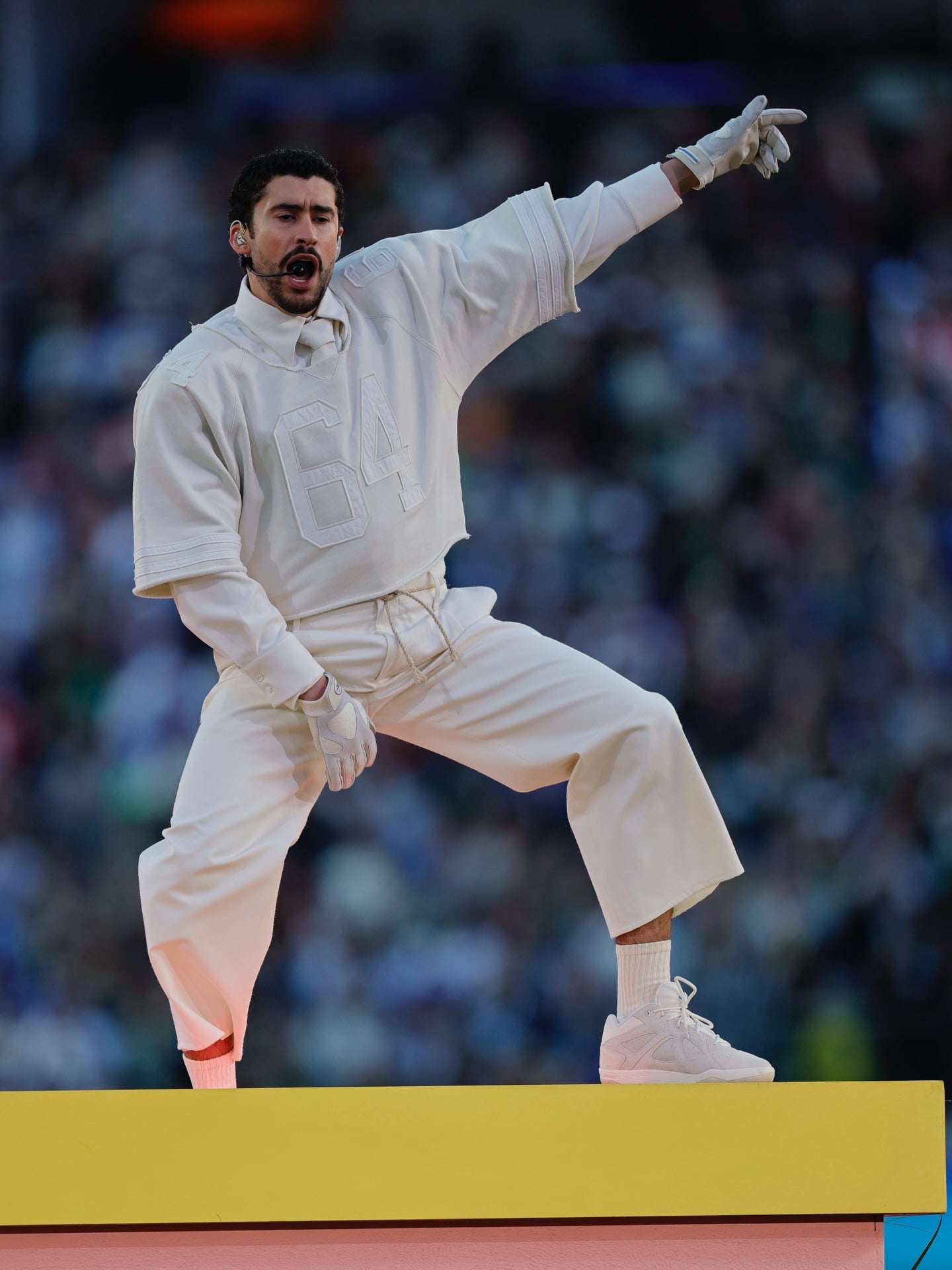 El atuendo de Bad Bunny fue un total look en tono crema, una decisión estética que rompió con la norma de que las estrellas del Super Bowl solo visten alta costura o piezas únicas de maisons de lujo. En su caso, el outfit consistió en: