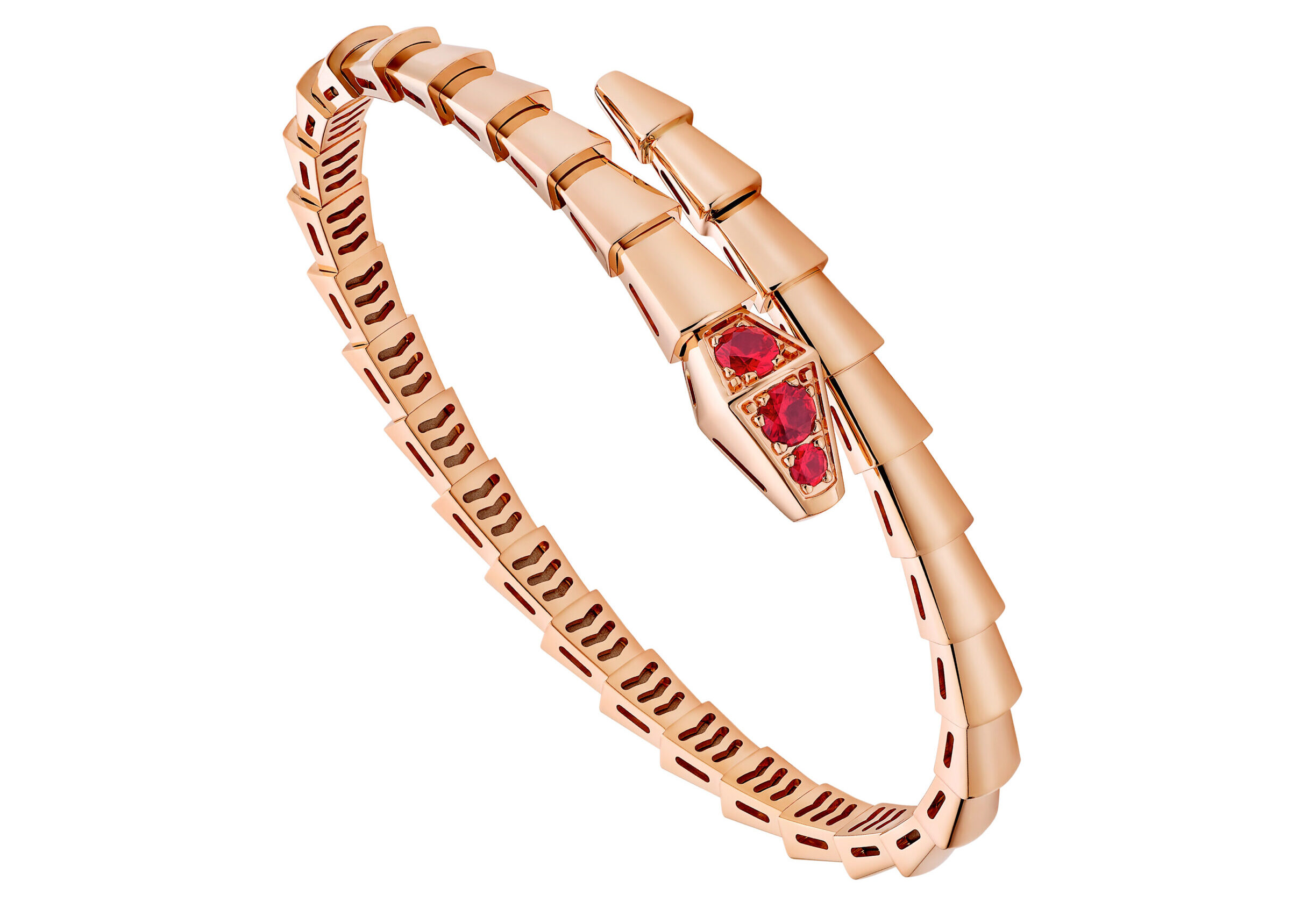 Junto a esta creación festiva, los códigos distintivos adquieren un brillo festivo. Serpenti Viper, la interpretación más esencial de Bvlgari de la mítica serpiente, revela detalles de rubíes que aluden a la prosperidad y la buena fortuna. Las escamas hipnóticas, con forma de cálido oro rosa, se ha convertido en un mensaje universal de transformación y elegancia empoderada, expresado a través de un collar de oro rosa con un colgante retorcido y un brazalete de una sola vuelta.
