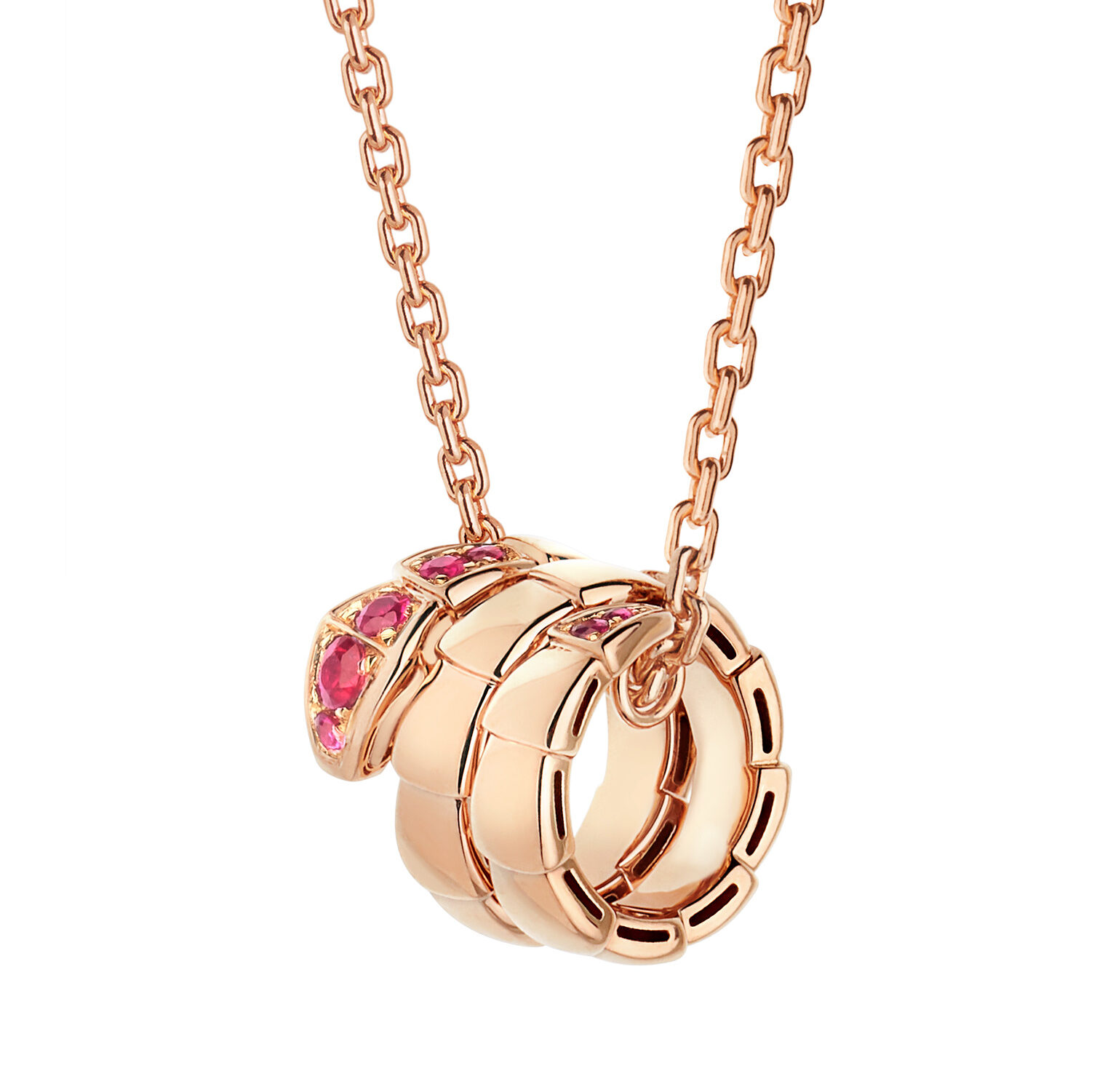 Enriqueciendo el surtido, el collar Serpenti Pallini en oro rosa presenta las intrincadas bolitas de oro soldadas que son el sello distintivo, inspiradas en el saber hacer artesanal de Bvlgari de la década de 1950, y está acentuado con pavé de diamantes y rubíes en la cabeza y la cola, así como penetrantes ojos de ónix negro.