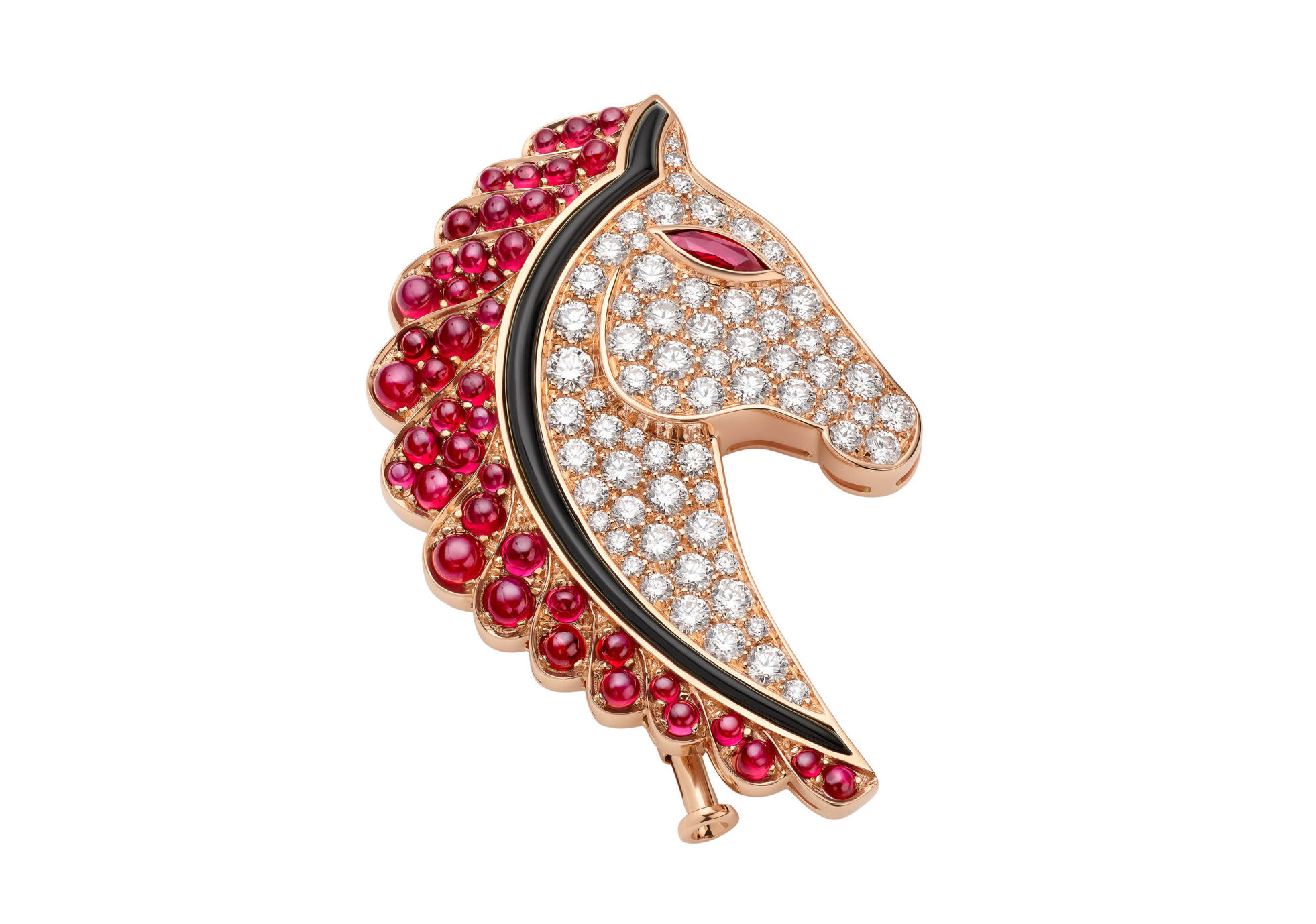 Diseñado para honrar el símbolo del año, se presenta un broche de caballo de edición especial en oro amarillo, inspirado en un diseño heredado de la década de 1970. Cobrando vida a través de 130 horas de diseño y 50 horas de orfebrería como testimonio del arte inigualable de la Maison, la pieza está incrustada con más de 40 rubíes cabujón, diamantes pavé e inserciones de ónix negro. Un talismán moderno, que canaliza el espíritu audaz del Caballo, deseando fuerza, éxito y comienzos auspiciosos.