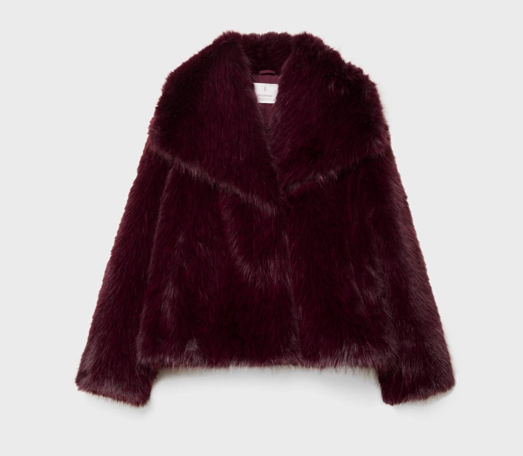 Cazadora corta efecto pelo en granate, de Stradivarius (su precio es de 59,99 euros)