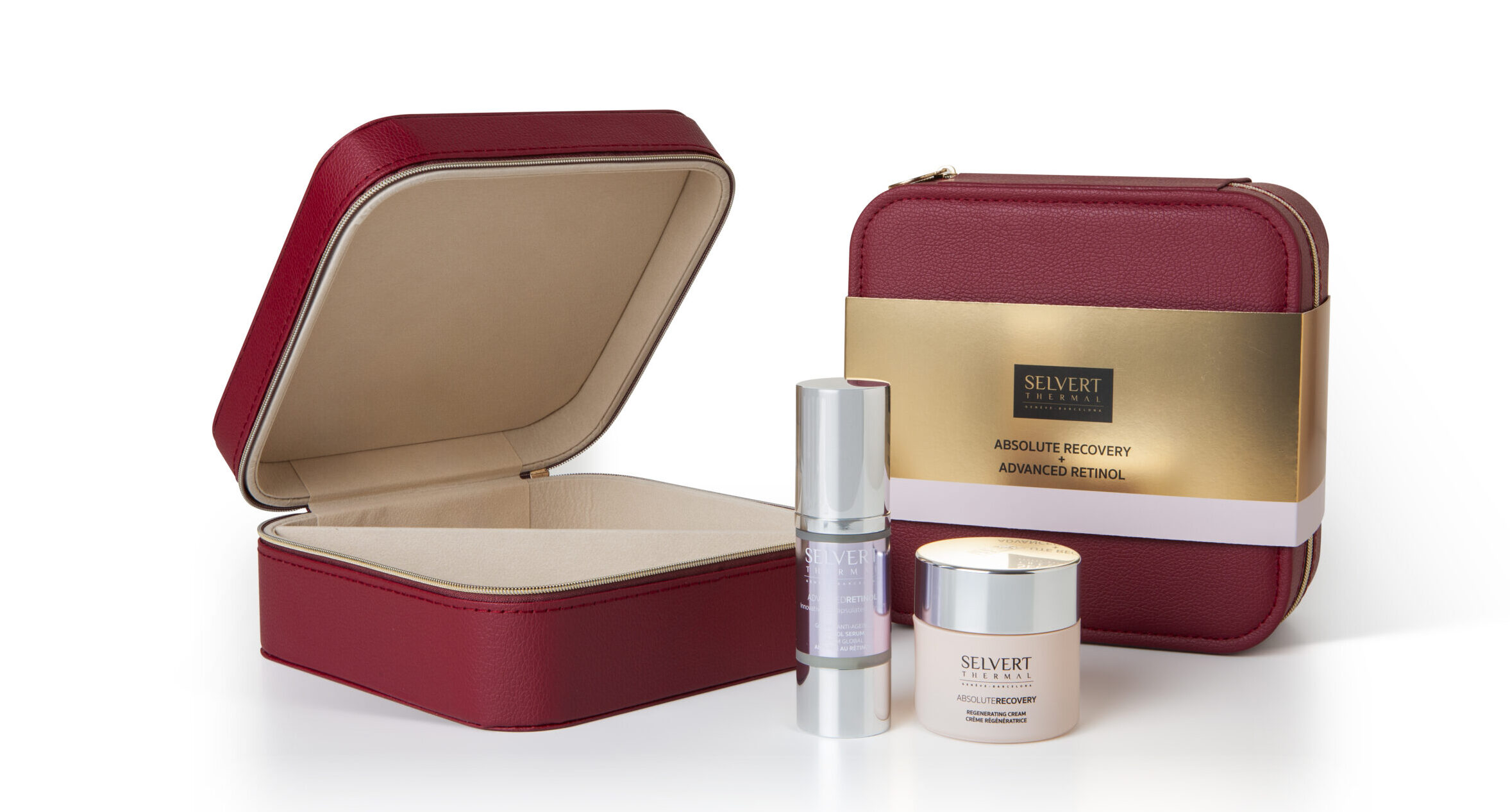 Estas fiestas, Selvert Thermal presenta su colección de estuches navideños en joyeros diseñados para regalar mucho más que cosmética. Nos quedamos con Absolute Recovery + Advance Retinol. Este tratamiento, eficaz para reducir la apariencia de las arrugas profundas y para restaurar y oxigenar la piel, contiene: Regenerating Cream (50 ml), compuesta por activos altamente regeneradores que ayudan a restaurar y oxigenar la piel, al mismo tiempo que favorecen la renovación celular; y Global Anti-Ageing Retinol Serum (30 ml), formulado con retinol encapsulado, sérum que penetra en profundidad en la piel para reducir la apariencia de arrugas profundas y líneas de expresión.