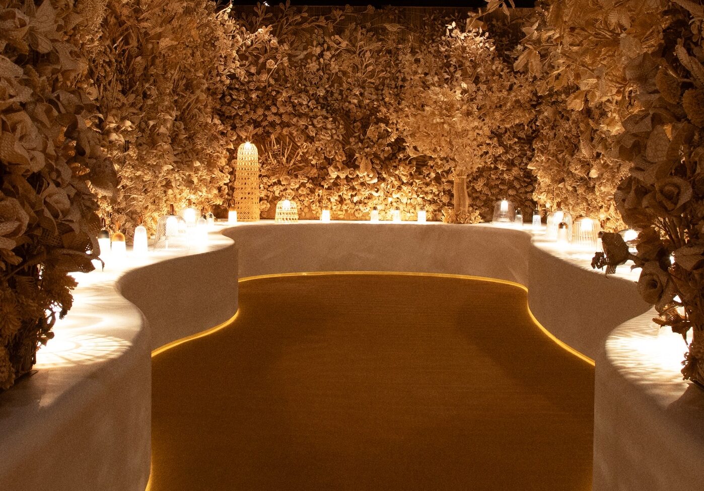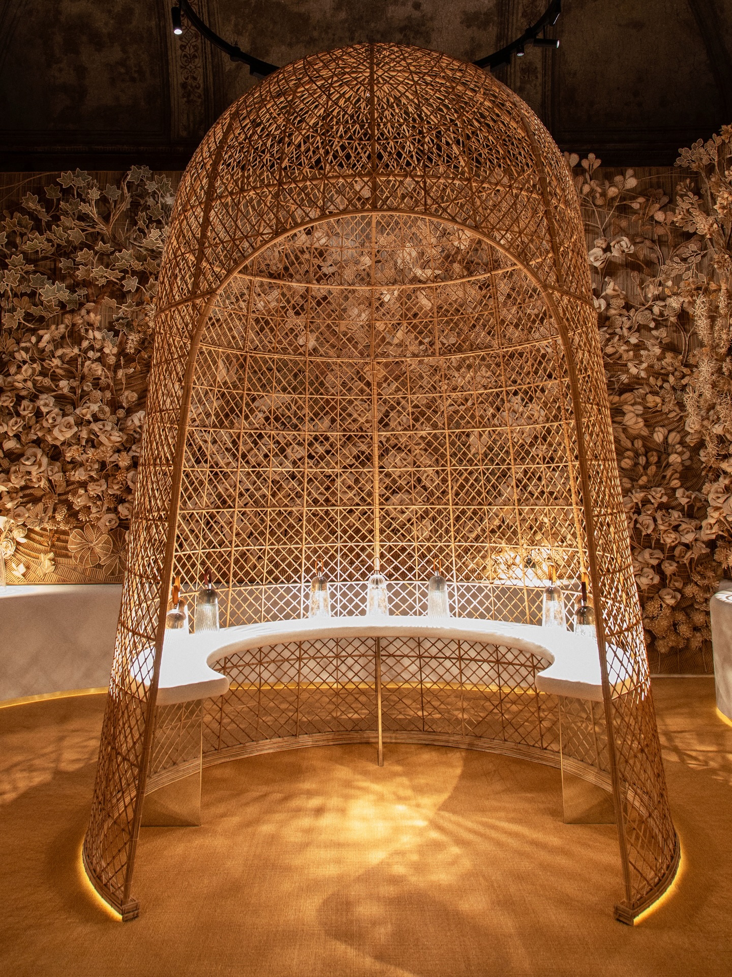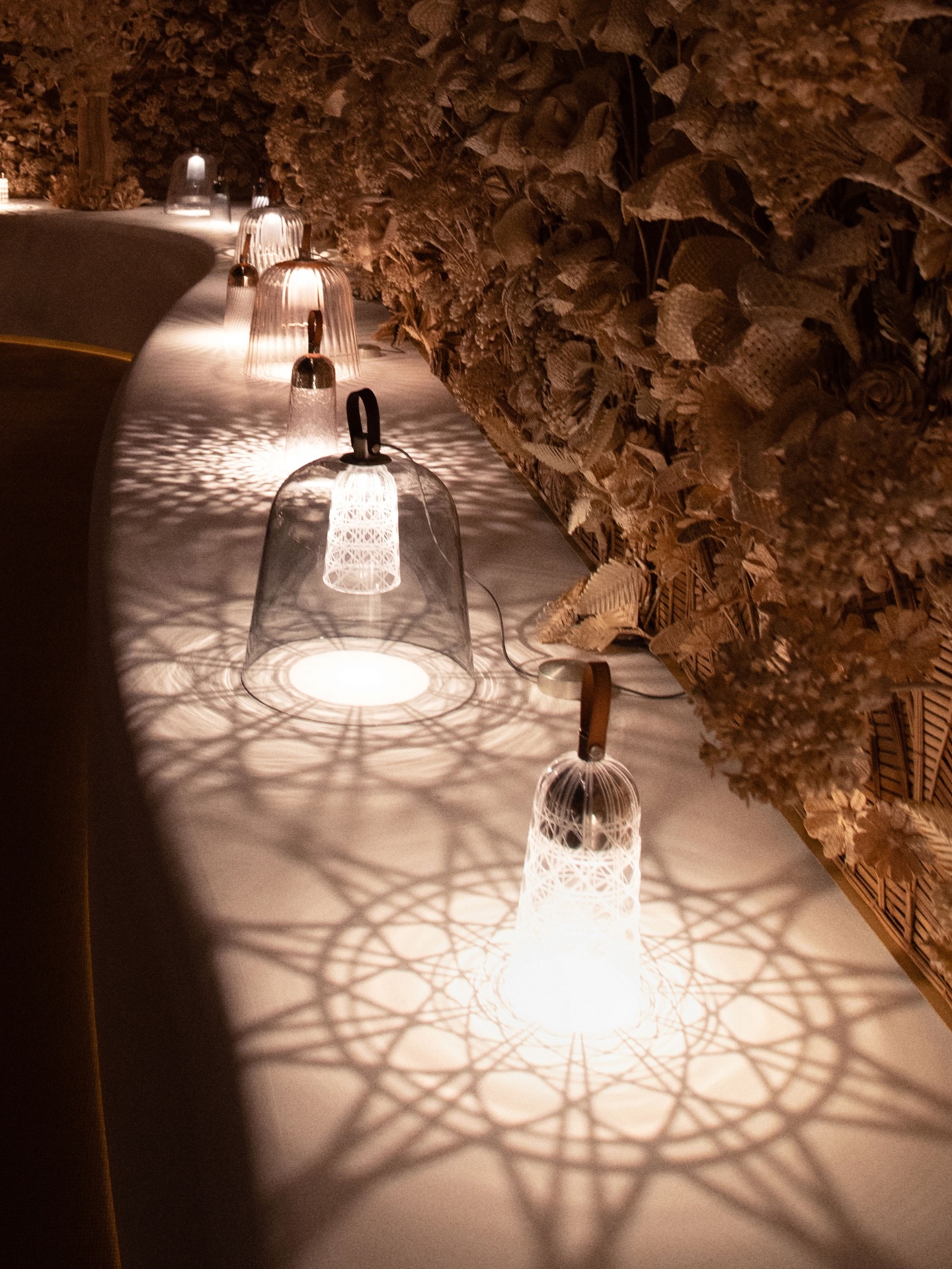 Realizada en vidrio soplado a boca según la tradición de los maestros vidrieros de Murano, Venecia, la campana se inspira en el movimiento del tejido —de los pliegues a los drapeados— y adopta un aspecto flexible y ligero. Otras luminarias celebran el arte de la cestería. La fibra de bambú Madake se corta, se refina y luego se teje para formar motivos estructurados de carácter gráfico que evocan el cannage.