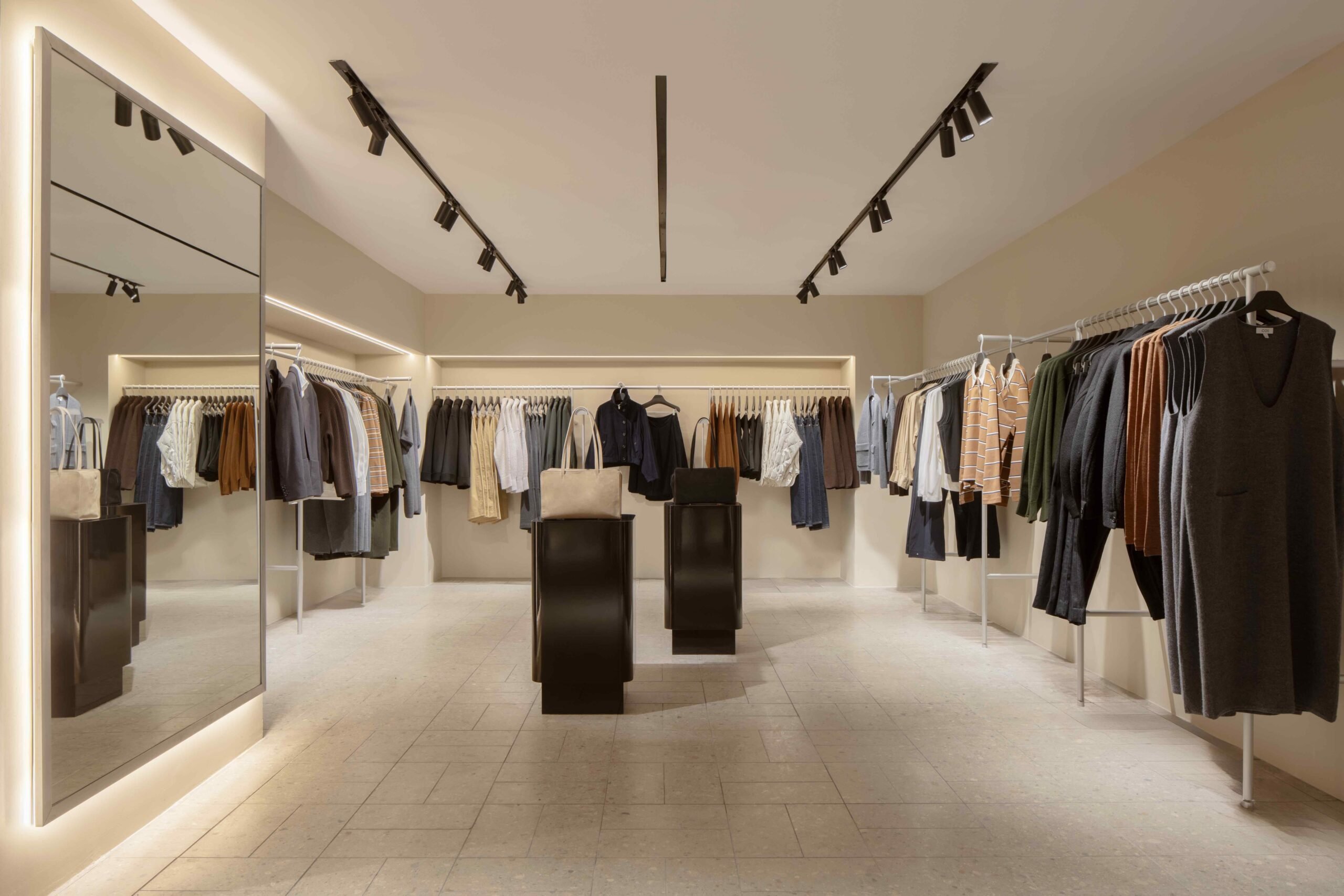 A lo largo de la tienda, el mobiliario marca el ritmo del recorrido. Las sillas escultóricas de contrachapado de Studio Goons se combinan con una mesa auxiliar cromada de inspiración setentera de Six The Residence. En la zona de moda masculina, la icónica silla Alky de Giancarlo Piretti se acompaña de una alfombra de bouclé tejida a mano de Kasthall, sobre un pavimento de terrazo de Grassi Pietre que se extiende por todo el espacio. En los probadores, los divanes y poufs de NORR11 aportan una suavidad orgánica, iluminados por la cálida luz albaricoque de los apliques Bon Bon diseñados por Helle Mardahl. En conjunto, estos elementos conforman un espacio definido por la integridad de los materiales y la artesanía más refinada.