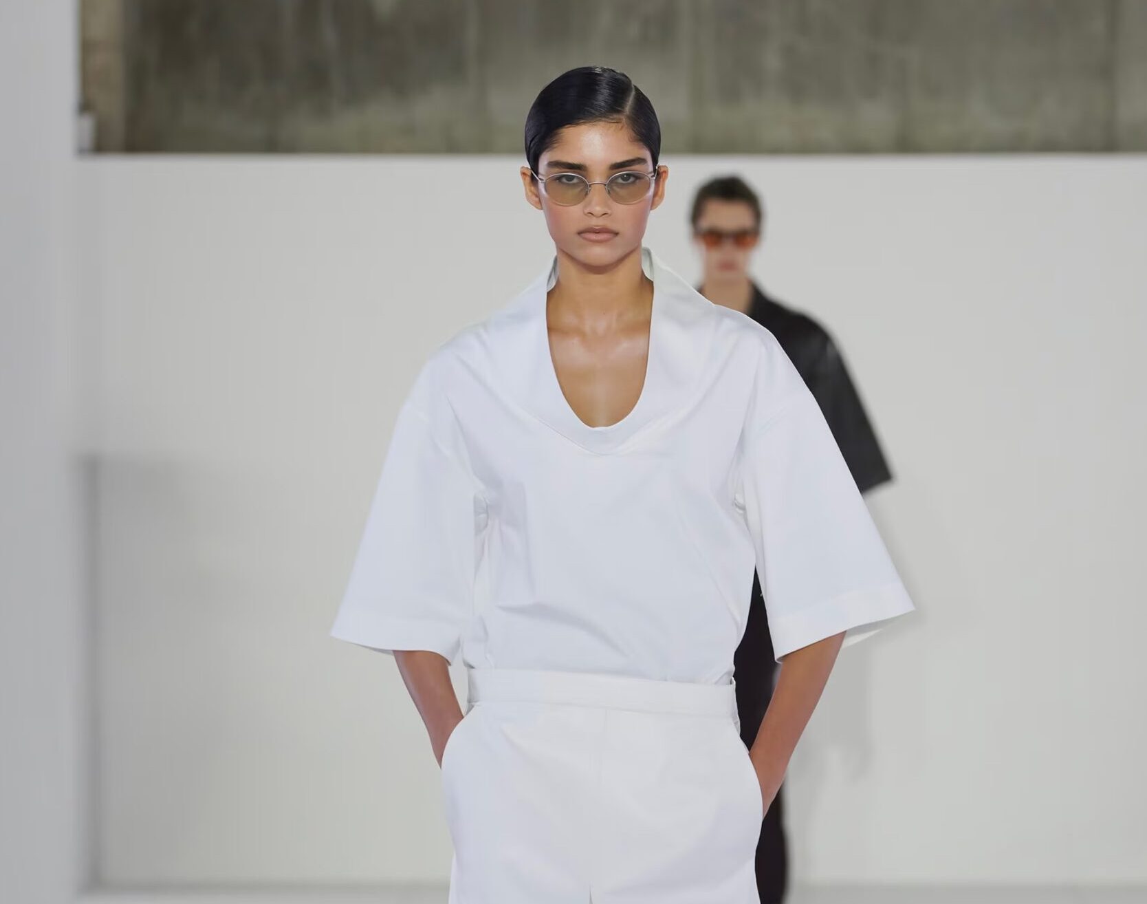 La exploración de los materiales potencia la dimensión de la colección: el cuero y los tejidos técnicos presentan un ligero brillo que acentúa la caída y la forma escultórica; superficies con acabado similar al papel introducen una textura arrugada y táctil; mientras que las mezclas de lino aportan profundidad. Sobre la pasarela, las transparencias dejaban entrever el cuerpo en movimiento, mientras que los tejidos ligeros y vaporosos fluían con naturalidad, reforzando una estética sutil y sofisticada.