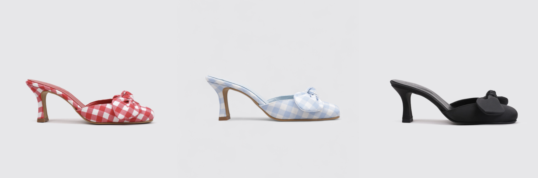 Rizzo es el mule más naíf de la colección. De textil con estampado vichy, un lazo decorativo y tacón acampanado de 7 cm, combina comodidad y estilo retro en un diseño perfecto para levantar básicos o acompañar vestidos de verano.