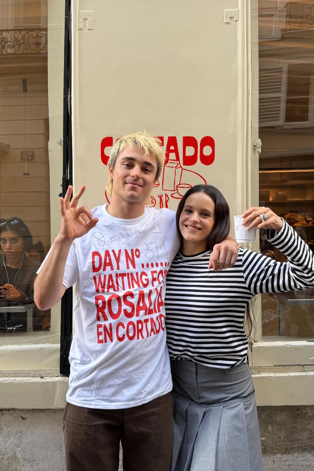 Durante más de un año, los fundadores del local —Helena Martín, Adrien Aymerich y su hermano Tom— mantuvieron una cuenta simbólica: “Día nº … esperando a Rosalía”. Esa camiseta colgada en su entrada era más gesto que marketing. Finalmente, 371 días después, la cantante catalana cruzó la puerta, tomó un café de avena y firmó esa misma prenda para el staff del local.
