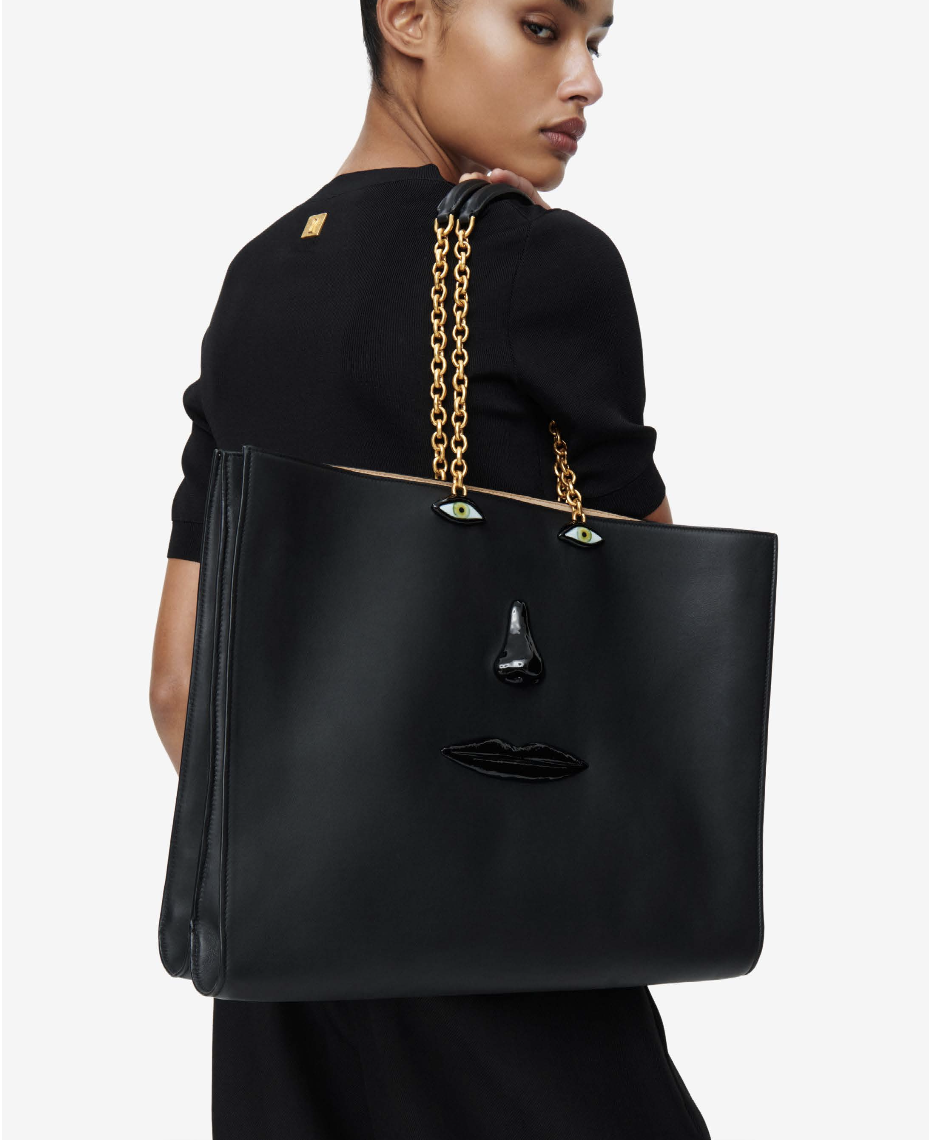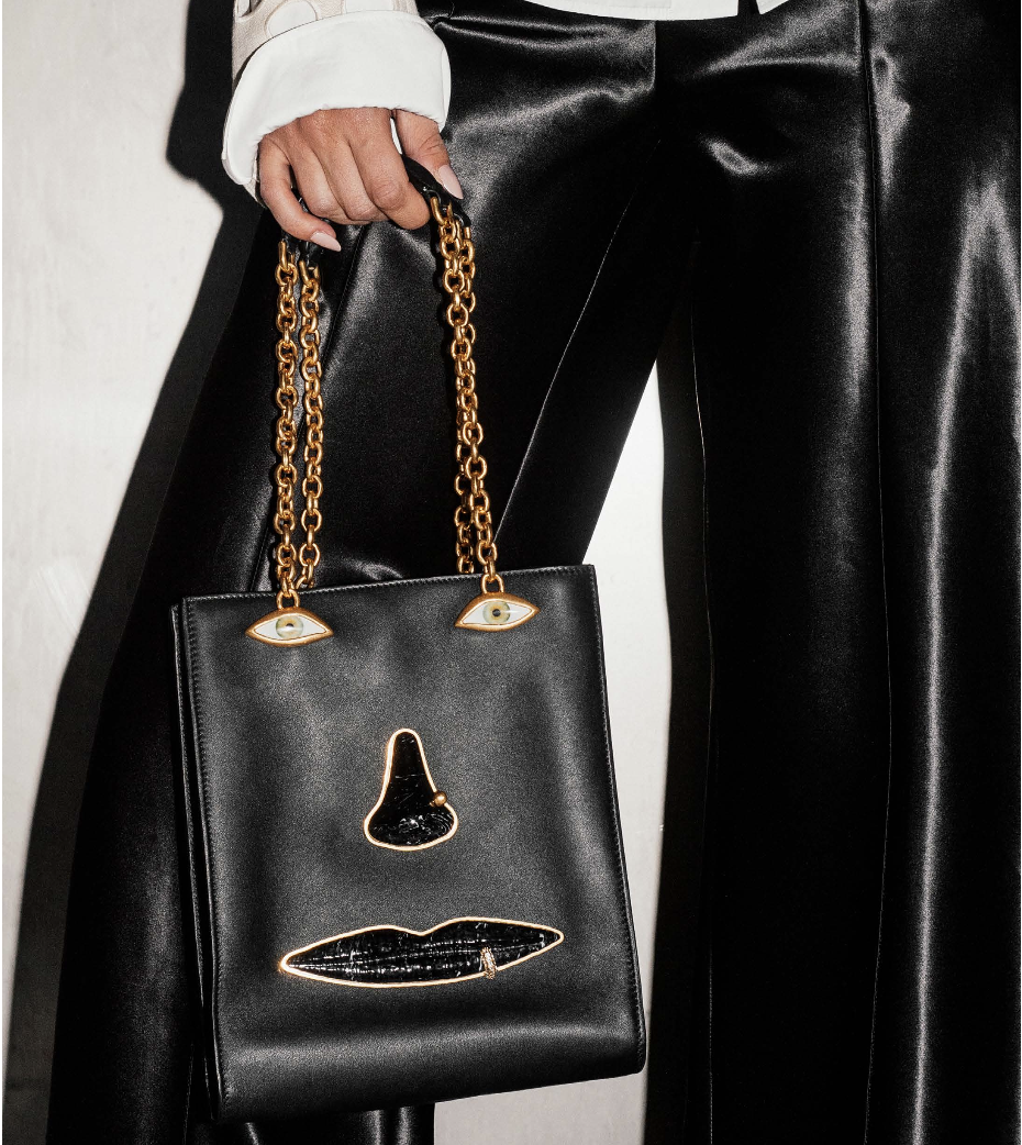 La historia continúa con un atrevido tote Face Bag en piel de becerro negra, adornado con joyería metálica esmaltada de inspiración anatómica que forma un impactante rostro en trampantojo. Más gráfico, más arquitectónico, transforma el icono en un compañero cotidiano con actitud de alta costura.