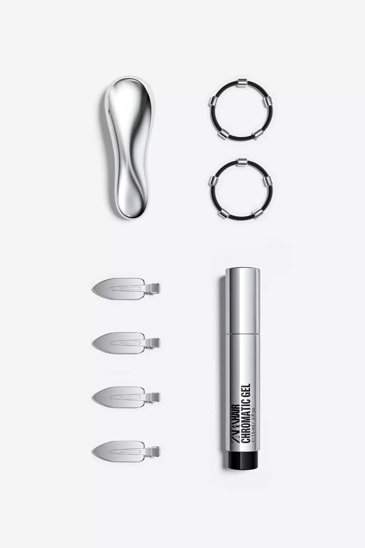 Un kit de styling creado en colaboración con Guido Palau, renombrado estilista y director creativo de Zara Hair, para llevar el brillo de las joyas a tu cabello. Cuenta con un gel capilar holográfico que funciona como maquillaje temporal, transformando el cabello con un acabado brillante y multidimensional que desaparece con un simple lavado. Además incluye diferentes accesorios inspirados en la joyería moderna que permiten experimentar, combinar y jugar con cualquier cabello para recrear infinidad de estilos.