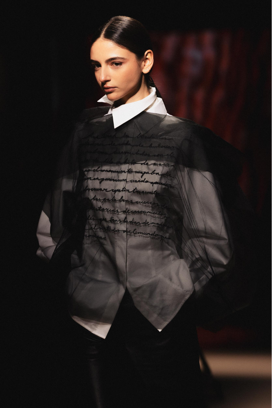 Desde el diseño, SIMORRA traduce este concepto en una colección que explora el tejido como superficie de escritura. Caligrafías bordadas a mano, a veces visibles, a veces ocultas, recorren tejidos que van desde la gasa hasta el paño. Tiras de texto impreso en napa se entrelazan como hilos, recordando que las palabras, como los tejidos, se construyen en relación. Micro-caracteres metálicos cosidos uno a uno atraviesan las costuras, componiendo mensajes que se descubren en el detalle.