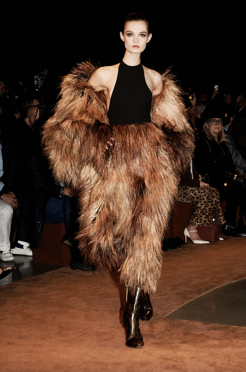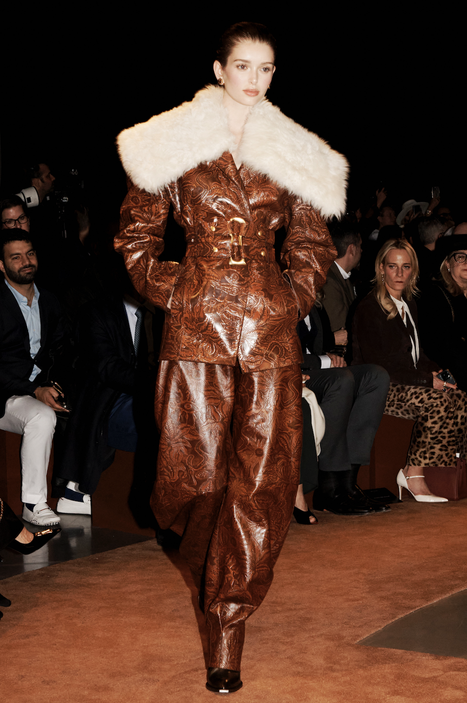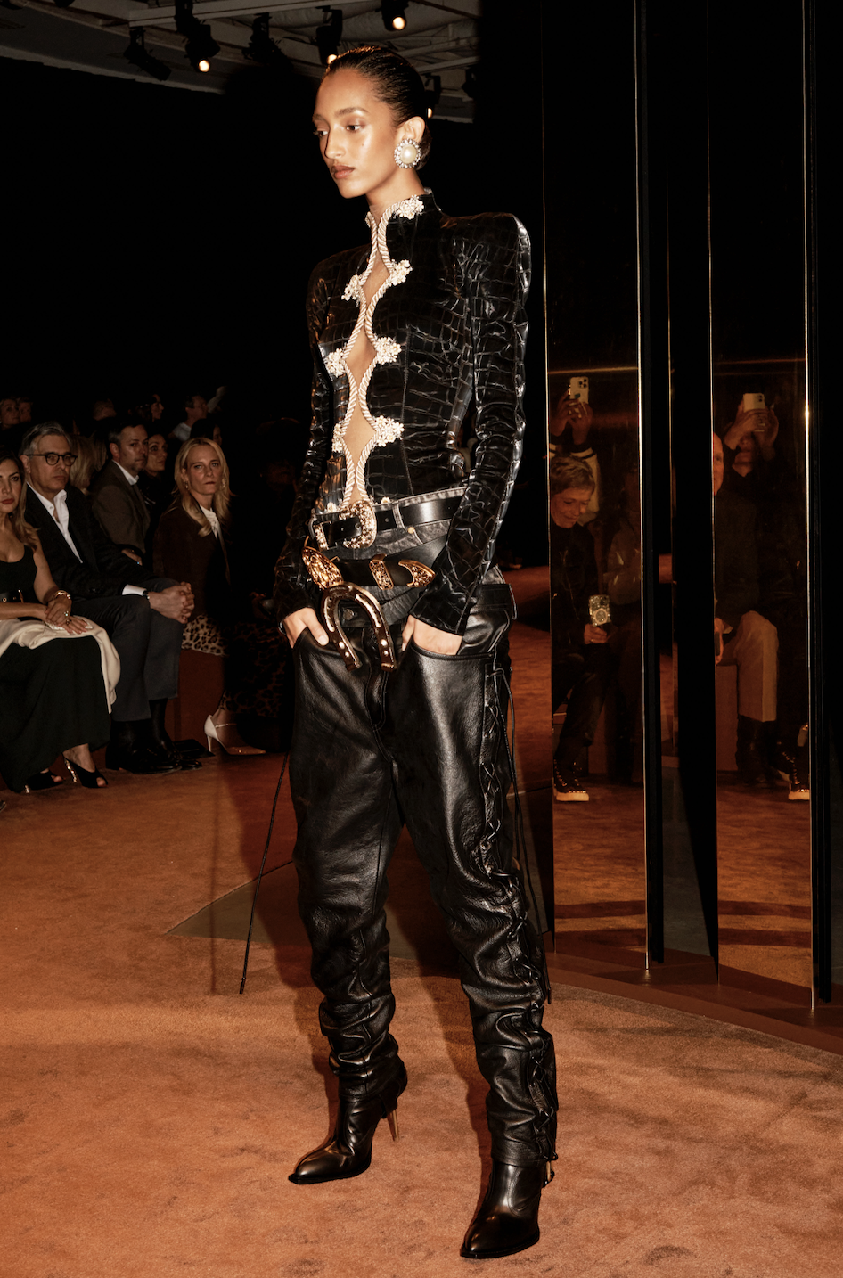 Esa tensión, entre lo masculino y lo femenino, entre la sumisión y el control, entre la extravagancia y el rigor, confiere a esta colección su frisado. De hecho, esas dualidades han inspirado nuestros tejidos: A las piezas rígidas como las clásicas botas cowboy, se les ha dado una forma y un lustre femeninos. La piel labrada (otro elemento básico del código vaquero) se reinterpretó en cinturones, botas y bolsos. Un pequeño bolso de mano que parece confeccionado de finas láminas de cobre está en realidad creado a partir de una piel especialmente tratada. Lo que parece rígido es blando, y viceversa.
