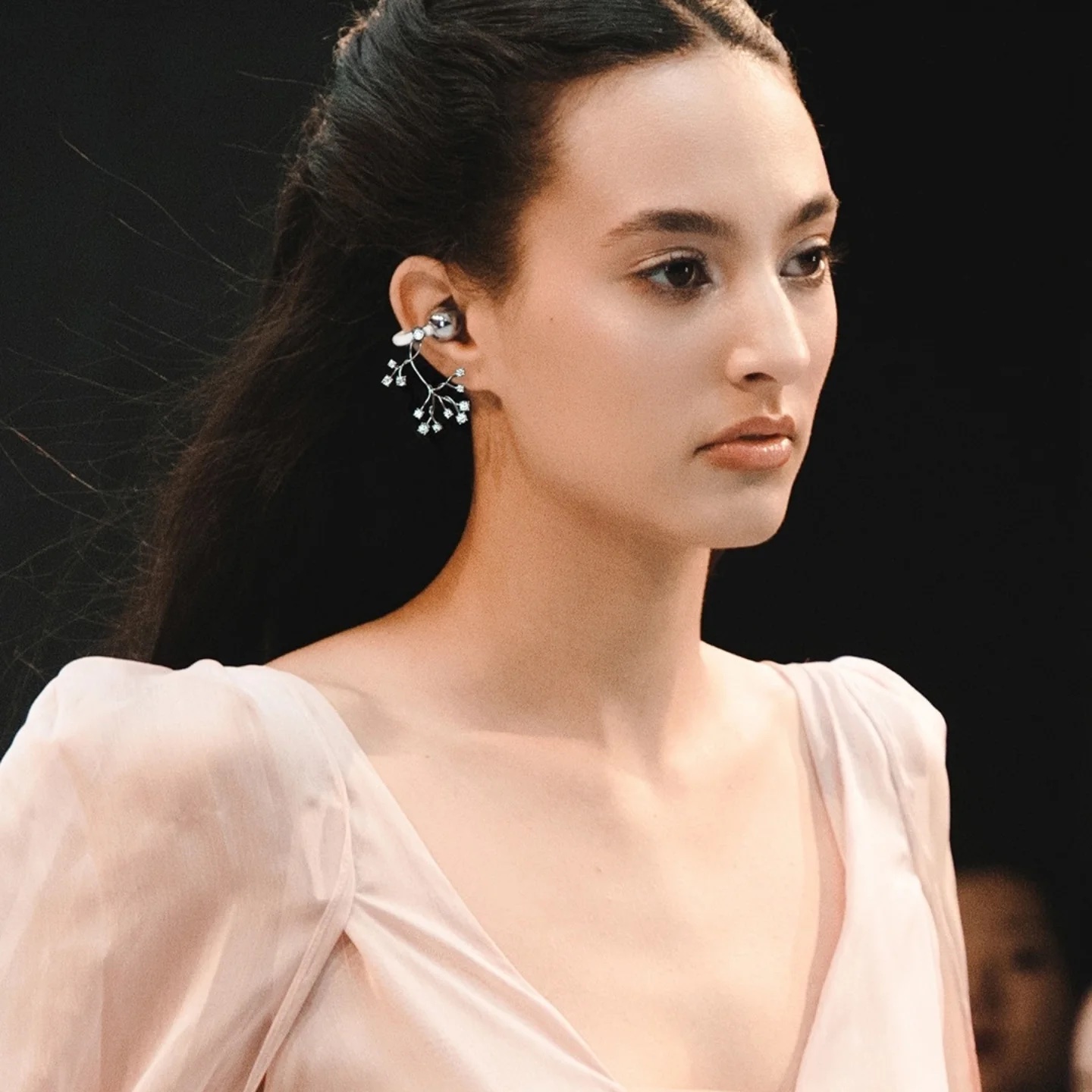 Charms, earcuffs, pequeños detalles joya que transforman el audio en complemento y el auricular en una pieza personalizable. El gesto es claro: el auricular deja de ser invisible para convertirse en parte de los outfits, como un pendiente o un collar. Tecnología que no compite con la moda, sino que dialoga con ella.