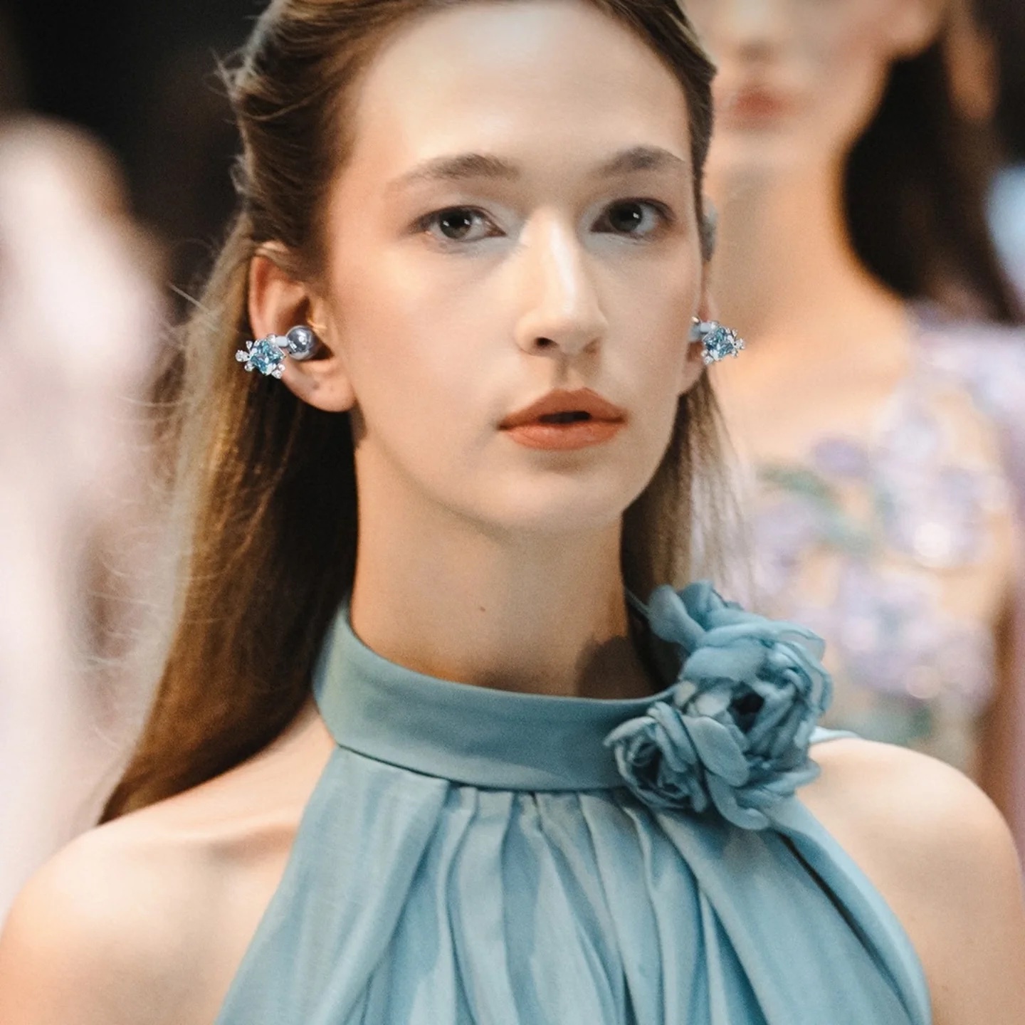 Pero no solo nos gustan porque parecen joyas, también porque la marca ha dado un pasó más uniendo moda y tecnología y as versiones en azul y blanco incorporan una textura tipo denim, un guiño inesperado que refuerza esa idea de libertad y comodidad estética. No son auriculares para esconder bajo el pelo: son para integrarlos en el look.