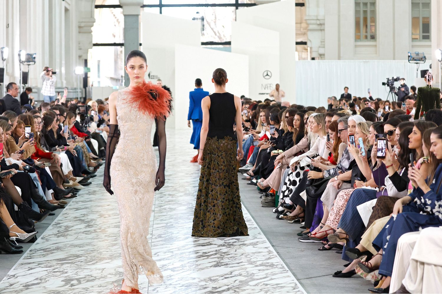 Las hombreras marcadas equilibran el volumen de las caderas, generando una arquitectura elegante y poderosa. Las chaquetas cortas de cuello elevado tipo caja aportan carácter, mientras que los vestidos entolados muestran el dominio de técnicas tradicionales de sastrería y alta costura.