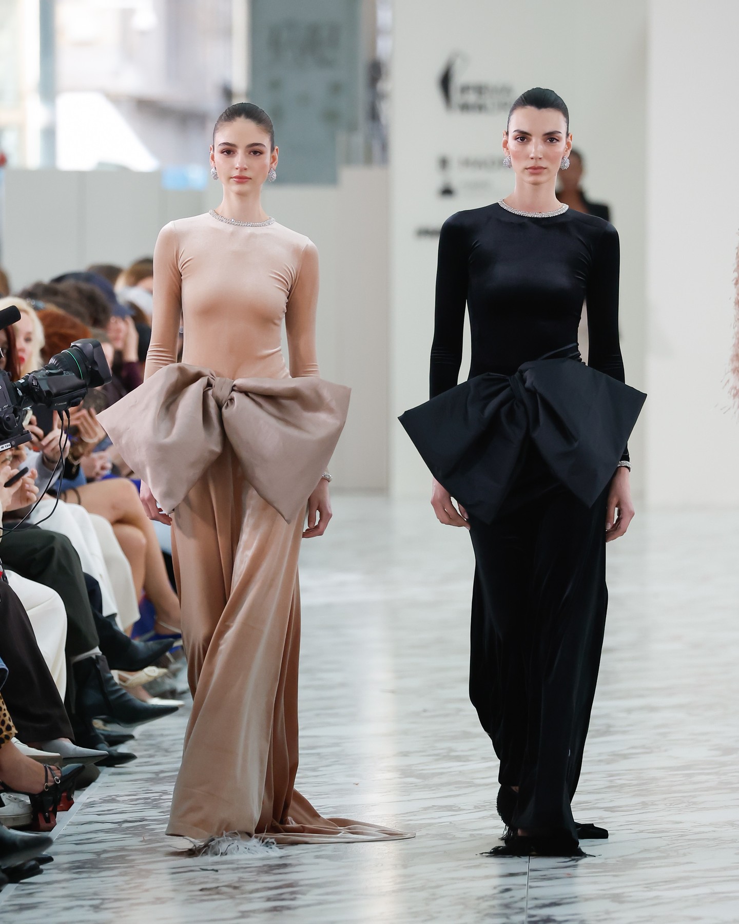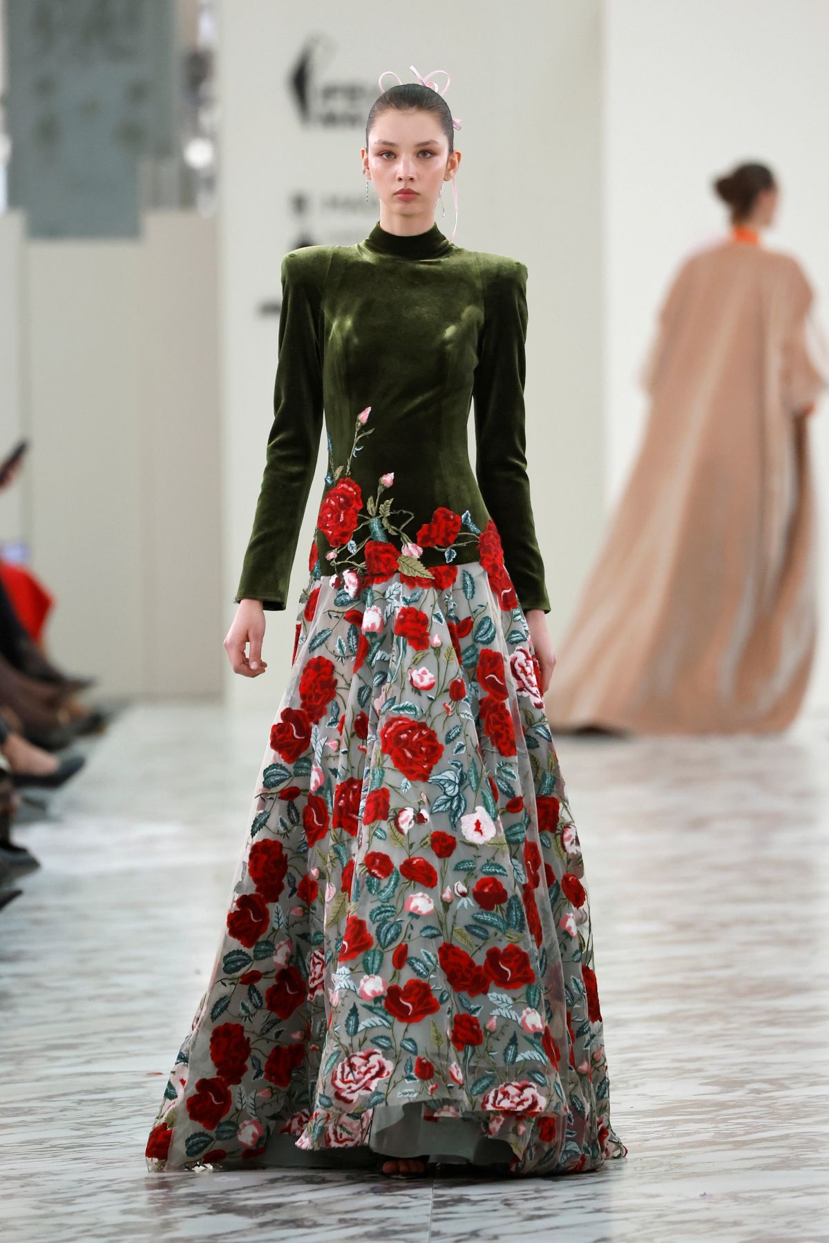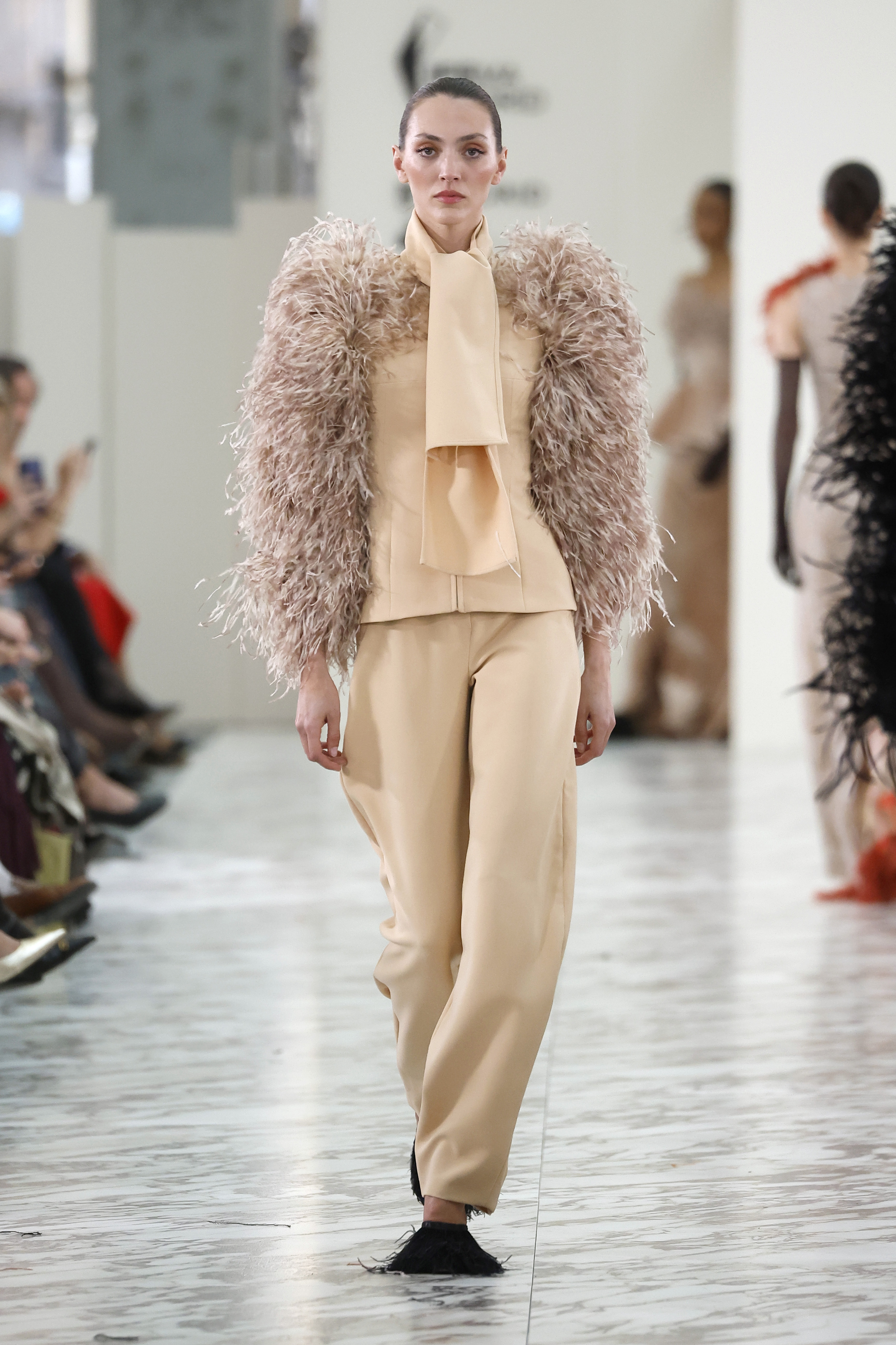 Uno de los gestos más contemporáneos de la colección es el protagonismo de los looks de dos piezas: pantalón y casaca, falda y chaqueta o vestido combinado con camisa. Estas combinaciones aportan una dimensión más invernal y sofisticada a la colección, proponiendo nuevas formas de vestir la alta costura en el presente.