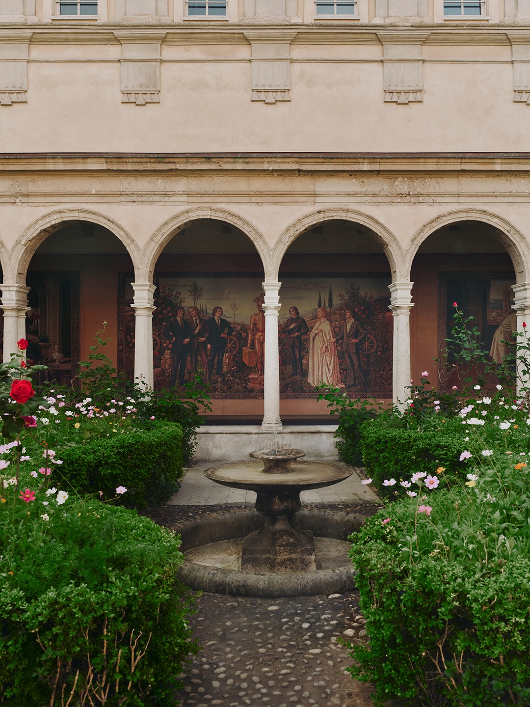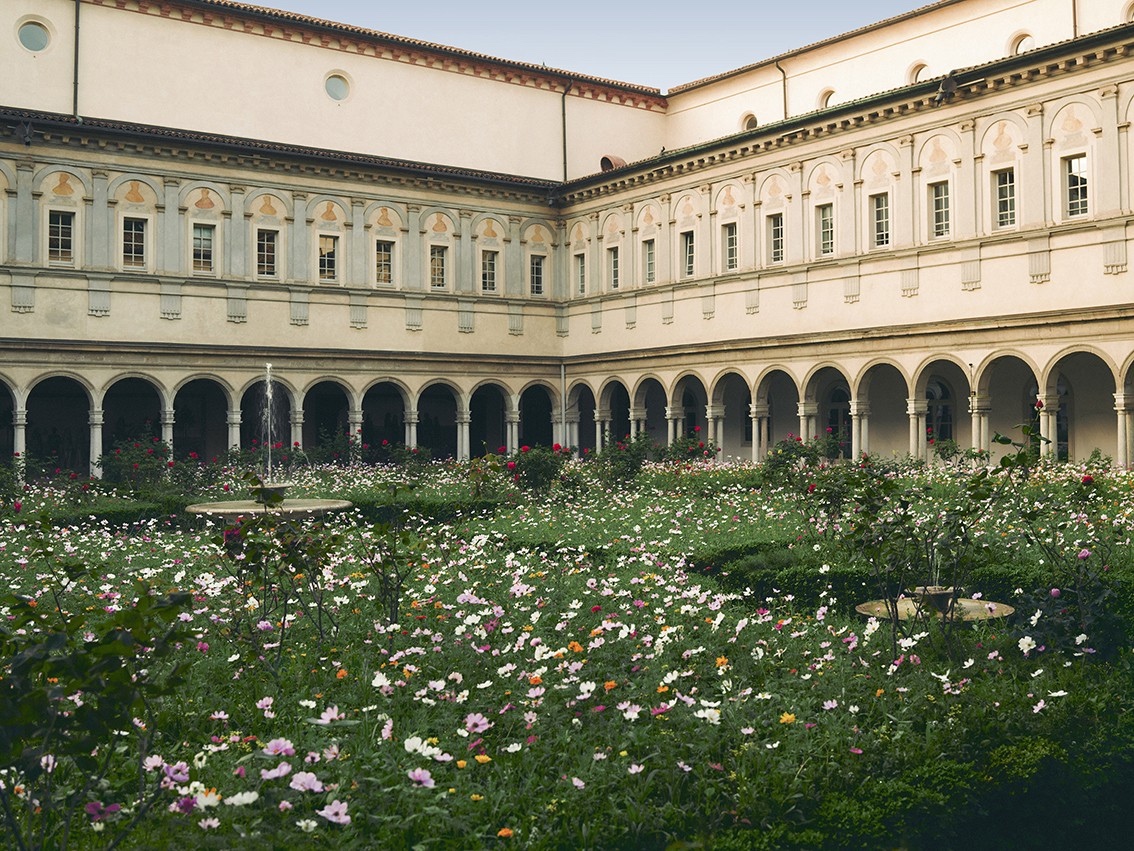 En el claustro principal, una instalación de jardín presenta flores de temporada especialmente cultivadas, inspiradas en el icónico motivo Flora, ampliando la exploración de la memoria y la reinvención.