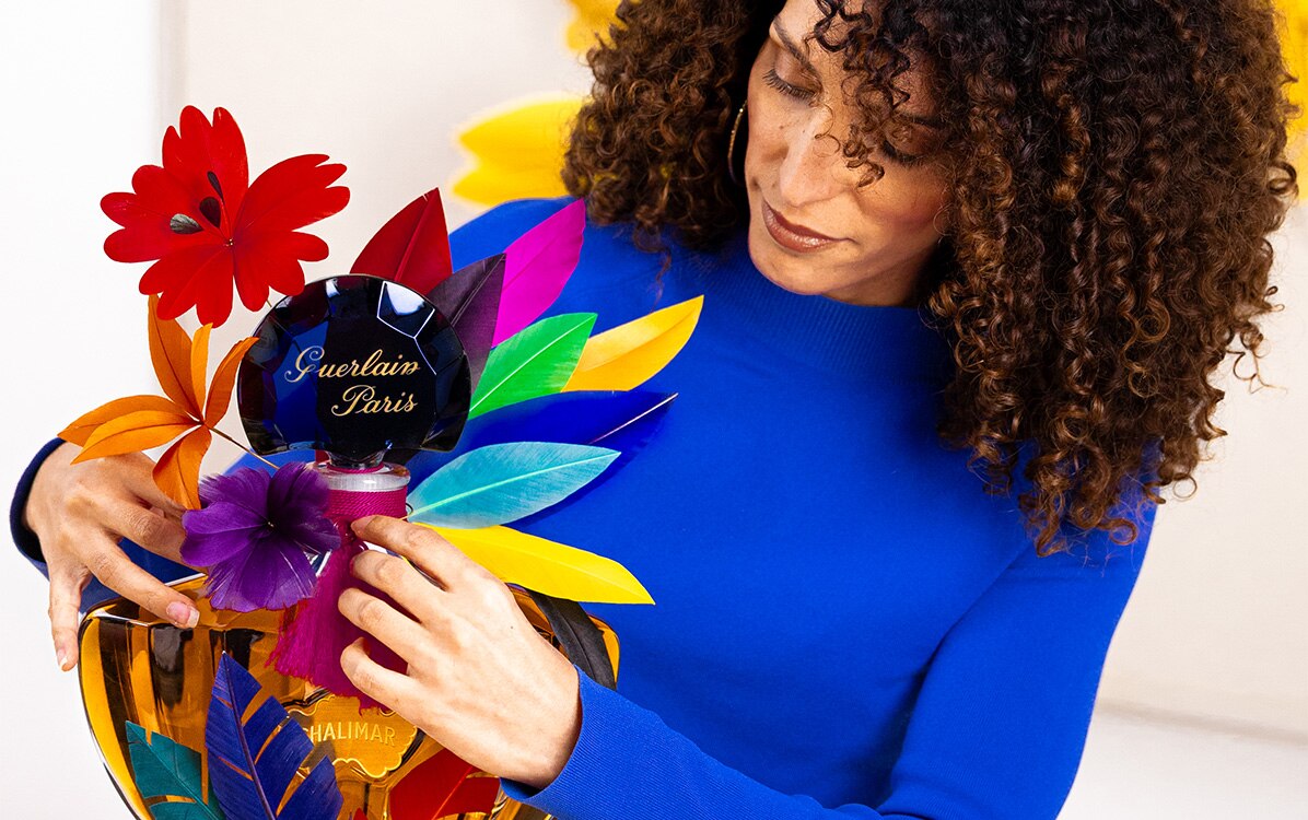 «El frasco de Shalimar ha sido una gran fuente de inspiración: tiene una forma muy marcada que evoca el busto de una mujer. He querido decorarlo con un adorno de plumas» (Janaïna Milheiro)