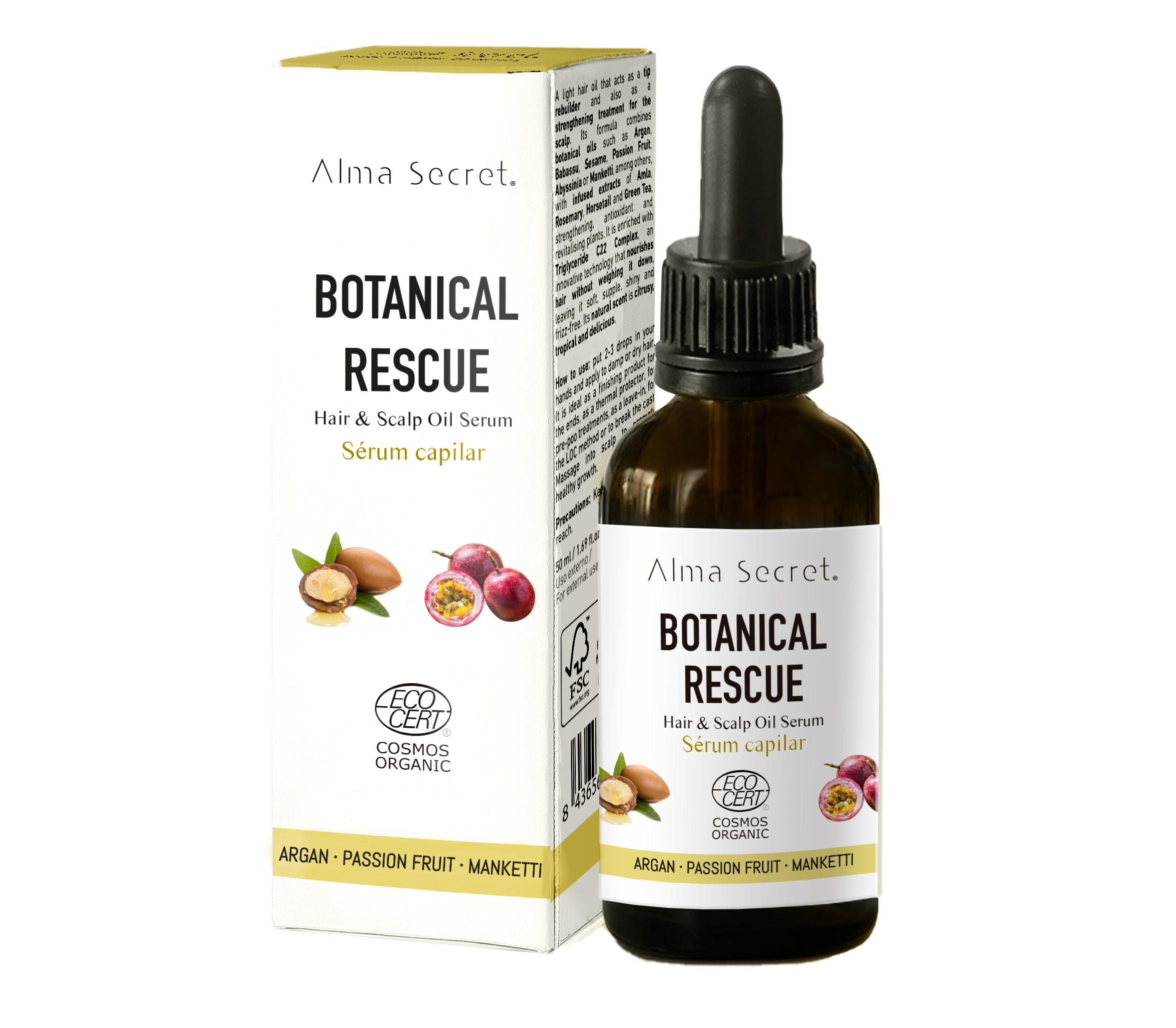 Si hay un producto que ha elevado este ritual a un nivel profesional, ese es BOTANICAL RESCUE, un sérum capilar multifuncional, ligero y 100% natural. Su fórmula combina aceites vegetales de alta calidad como el Argán puro ecológico, que nutre y controla el frizz; el aceite de Manketti, con acción protectora frente a la radiación UV; la Fruta de la pasión, que equilibra y revitaliza gracias a su alto contenido en omega 6; o el aceite de Babasú ecológico, perfecto para calmar y reparar cabellos secos o cueros cabelludos sensibles.