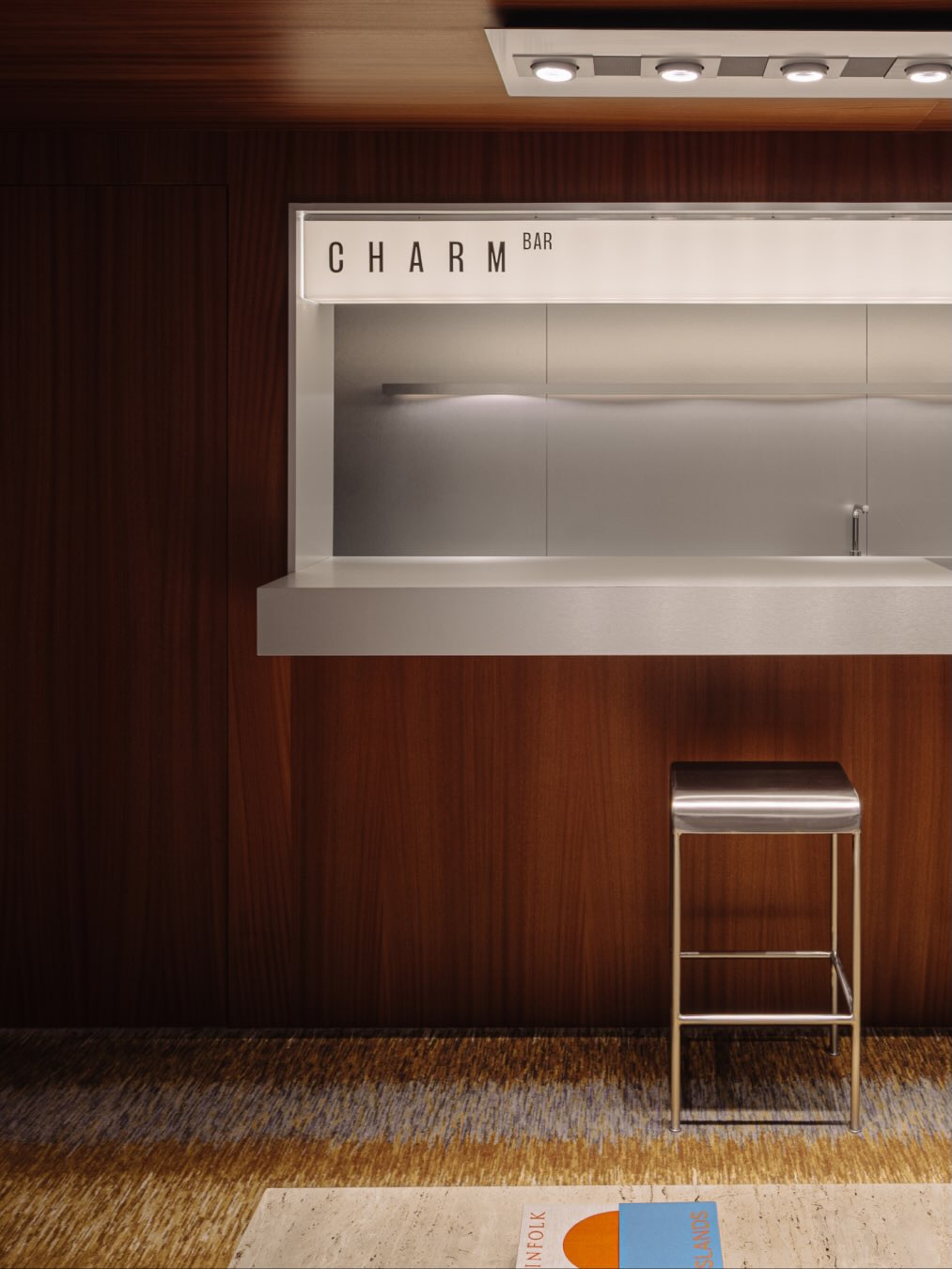 El techo juega un papel crucial en la zonificación: en las áreas de venta, una rejilla metálica integra iluminación técnica y tamiza la luz; en las zonas de estancia y en el Charm Bar, los techos y paramentos de madera aportan calidez visual y acústica.
