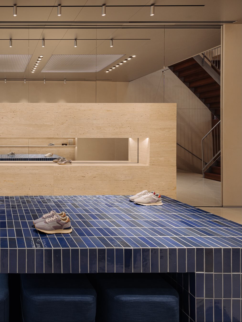 El mobiliario expositivo, diseñado como parte de la arquitectura por El Departamento, incluye la isla central, híbrido entre mesa de exposición y zona de asiento, y en la mezzanine, sofás, butacas bajas y mesas de centro que refuerzan la idea de un espacio vivido, más cercano a un lounge que a una tienda convencional.