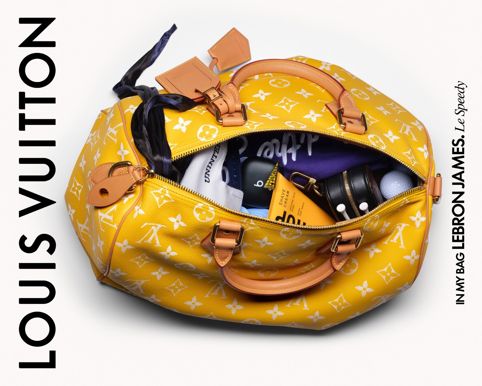 La leyenda del basquetbol, medallista de oro olímpico y varias veces campeón de la NBA, LeBron James, abre su Speedy P9 amarillo: una cápsula personal de artículos esenciales con pelotas y tees de golf, junto con básicos de aseo como crema de afeitar y su gorra distintiva.
